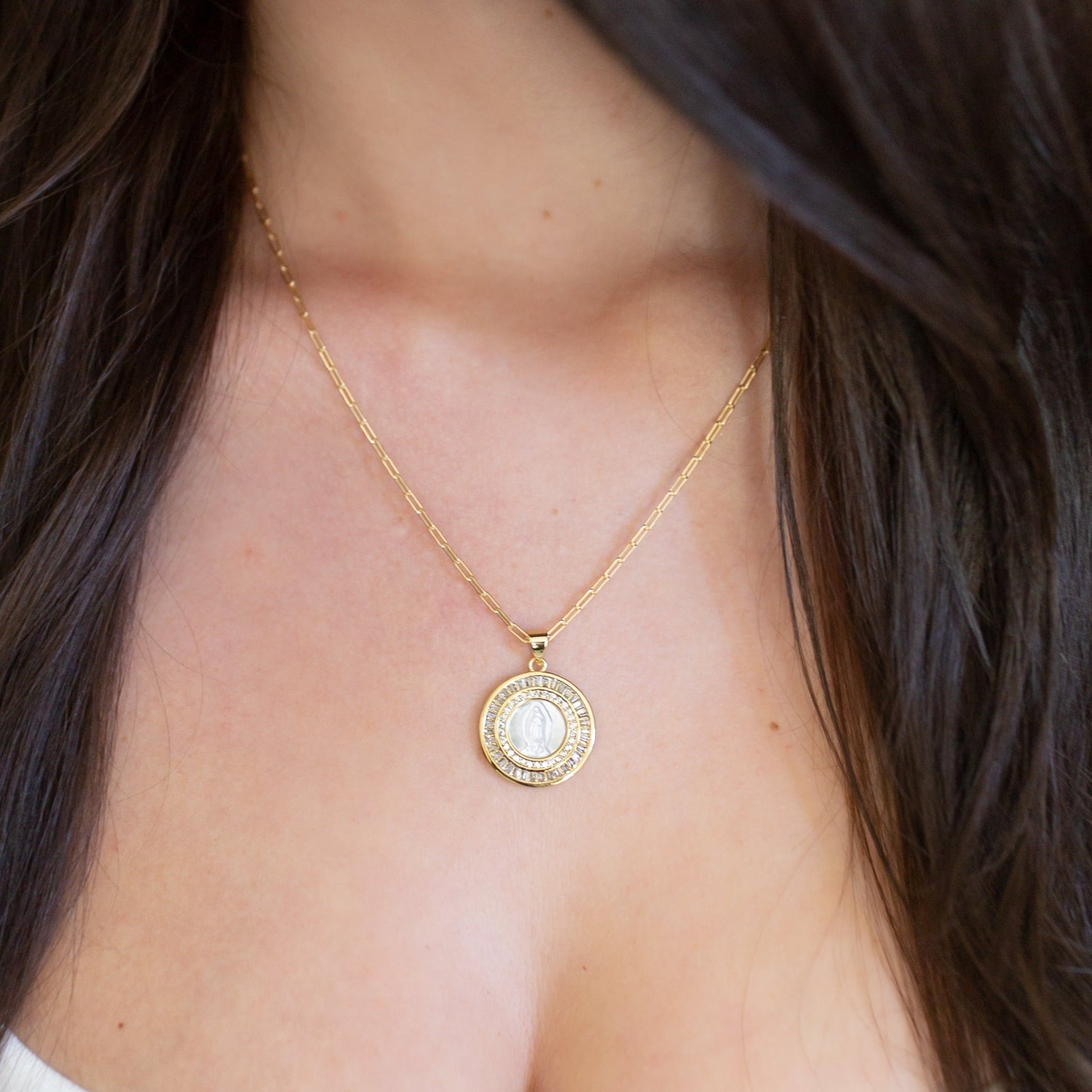 An iconic Joy Dravecky design, The Mother Mary is a luminous symbol of faith and style. Featuring a glowing mother of pearl center framed by sparkling baguette and round stones, this gold-finished pendant is made to shine—whether worn solo or layered.