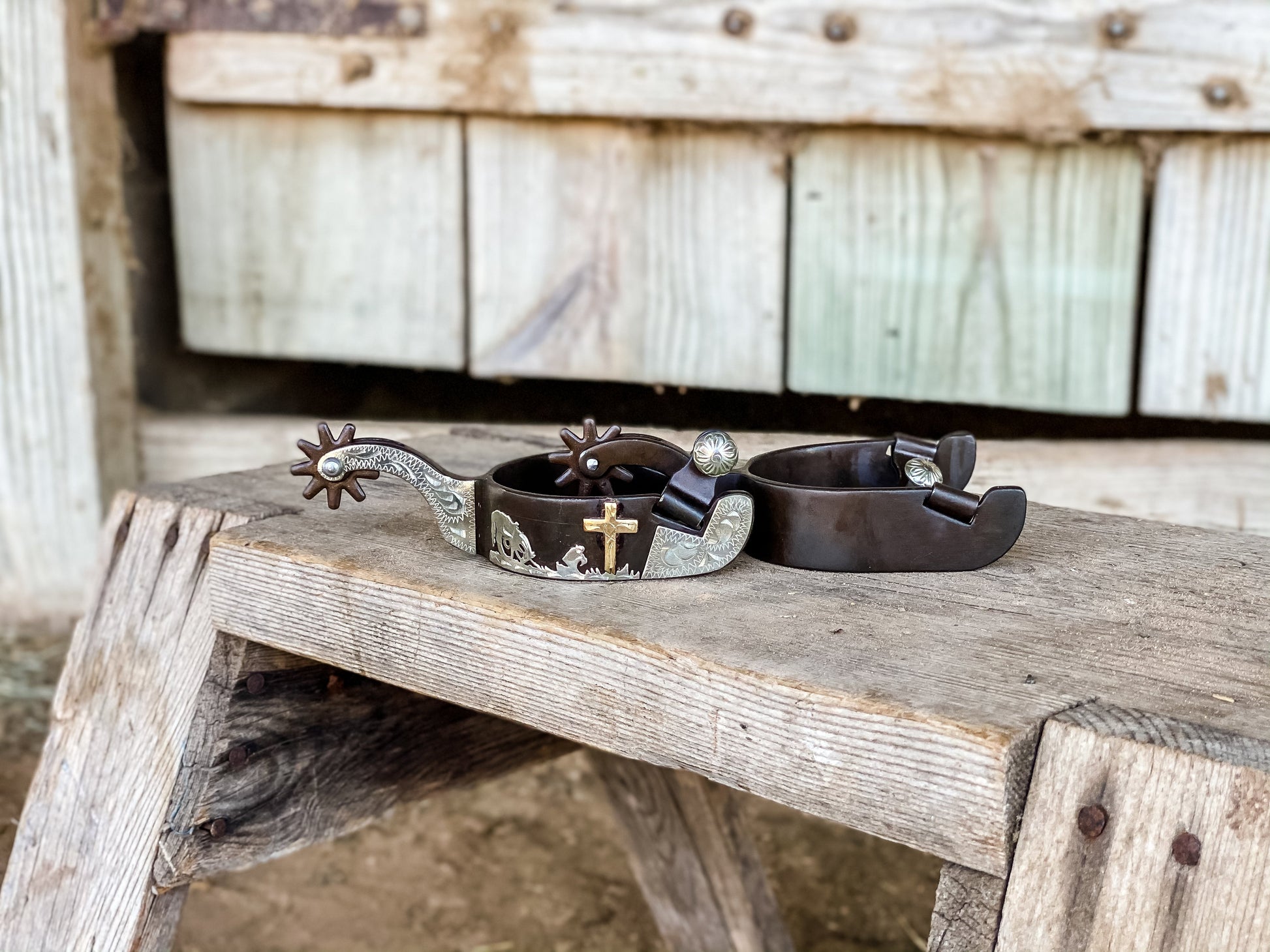 The AJ Tack Praying Cowboy Antique Brown Spurs are designed for western riders who appreciate both style and craftsmanship. These antique brown show spurs feature a hand-engraved silver overlay with a praying cowboy and cross motif, adding a meaningful touch to their elegant design. Built for durability and performance, they provide a secure fit and smooth functionality in the saddle.