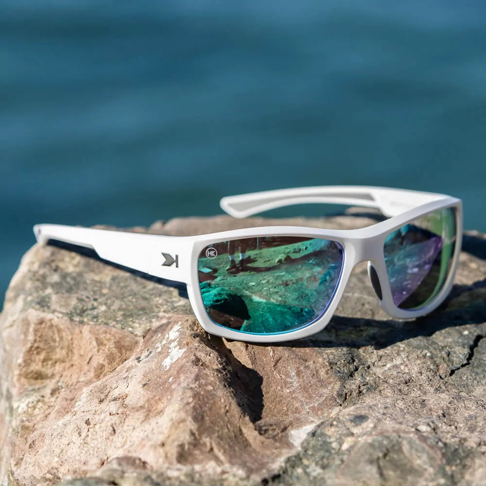 Effortlessly cool with a cosmic, modern vibe, Aura High Stakes bring celestial style to any adventure. The sleek white frames contrast with cool grey rubberized details, while bright chrome ‘K’ logos add a touch of shine. Morning Moonshine polarized mirrored lenses evoke dreamy sunrise strolls, and thanks to the anti-saltwater coating, the view stays crystal clear. Whether you're chasing the tide or lost in a daydream, these stellar shades prove that a little whimsy is always in style.