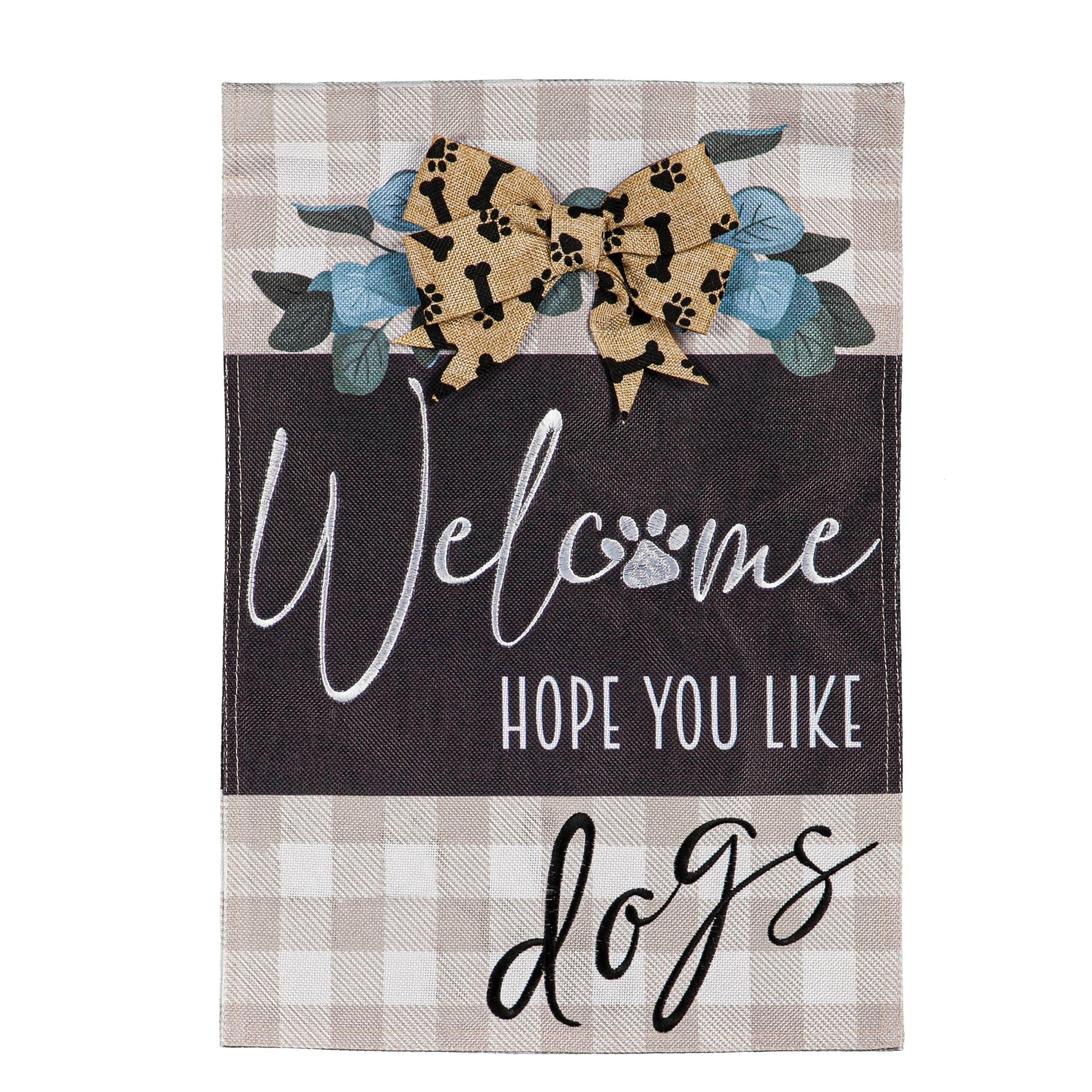 This adorable flag is a charming way to let visitors know that four-legged friends are welcome. A "Welcome. Hope You Like Dogs" message is sitting against a neutral-toned checkerboard background with a bow accent that has a dog bone pattern for added flair. This flag is made of medium-weight, soft burlap fabric that's made from recyled plastic that has the look and feel of real burlap. Artwork is heat transferred onto both sides of the textured fabric to create a natural, crafted look. The flag is durable and weatherproof and will not fade or fray after continued display. This flag features a sleeve for use with any standard flagpole or stand, sold separately.