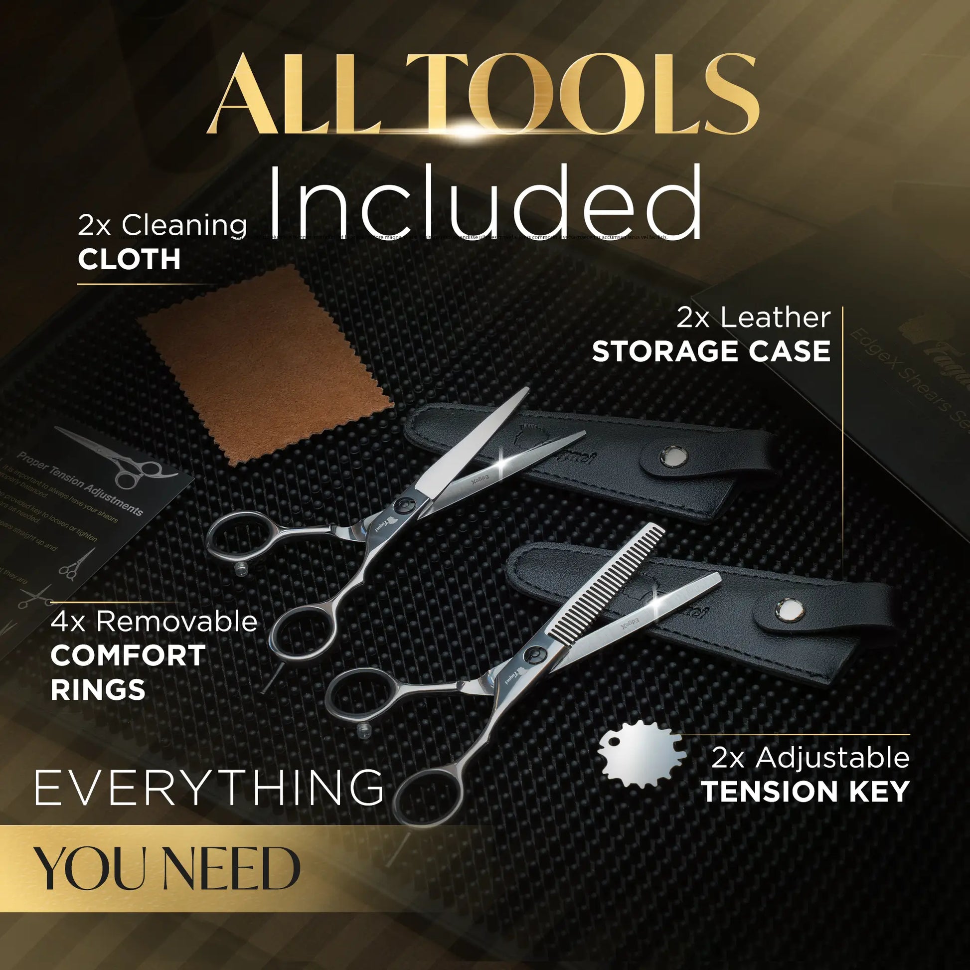 ALL ESSENTIALS INCLUDED - Featuring a blade tension key, safety sheath, cleaning leather, and comfort rings, these shears and thinning scissors offer everything for an exceptional cutting experience.
