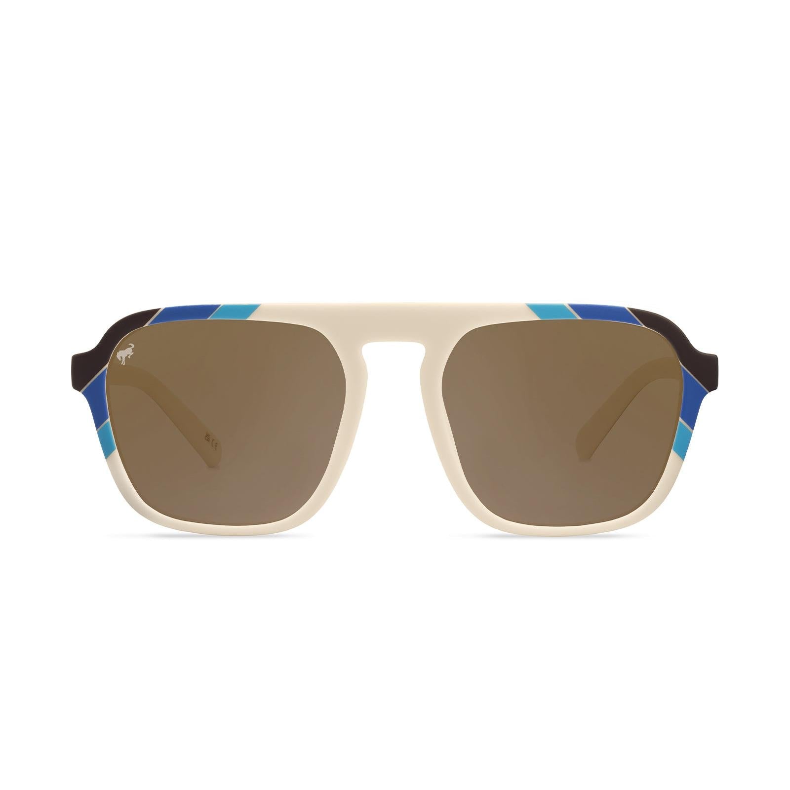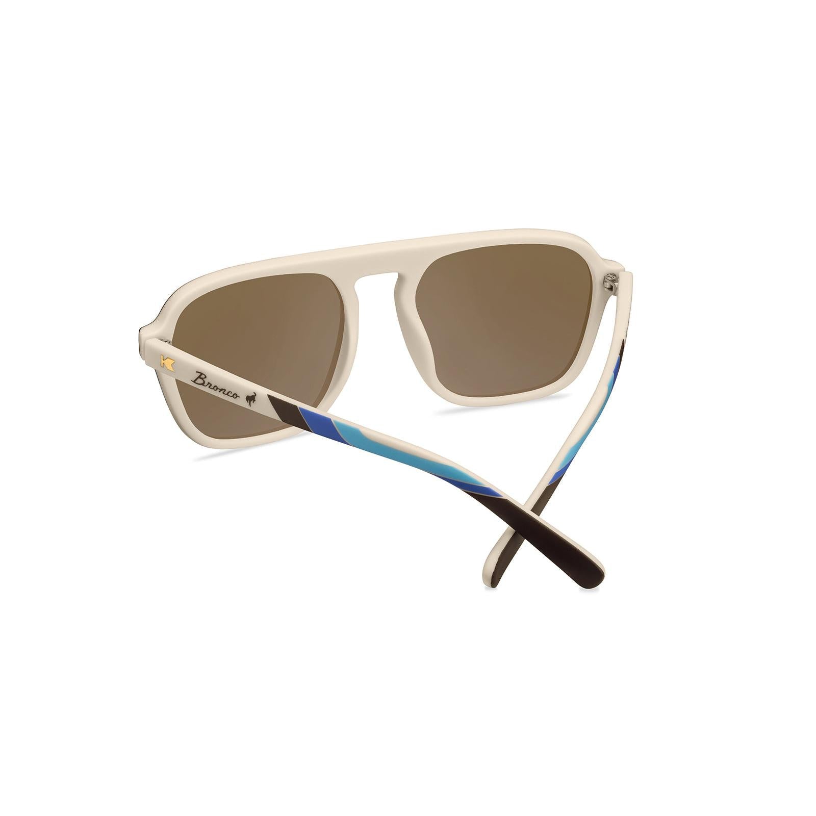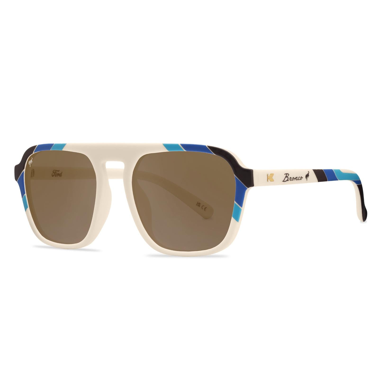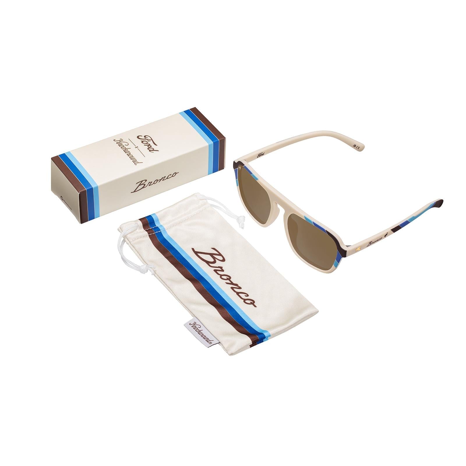 The Ford Bronco Pacific Palisades are a must-have for any fan of the adventurous spirit the revolutionary SUV evokes. Inspired by Bronco’s classic lines and instantly recognizable style, these sunglasses feature a light sand-color base color with a blue tri-color accent stripe along the front and arms. The Bronco’s iconic horse and script text logos officially stamp the outside of the frame, while the Ford logo on the inside of the arm reminds us of the history behind the nameplate. Always-in-style polarized amber lenses round out this retro-but-wearable pair of shades.