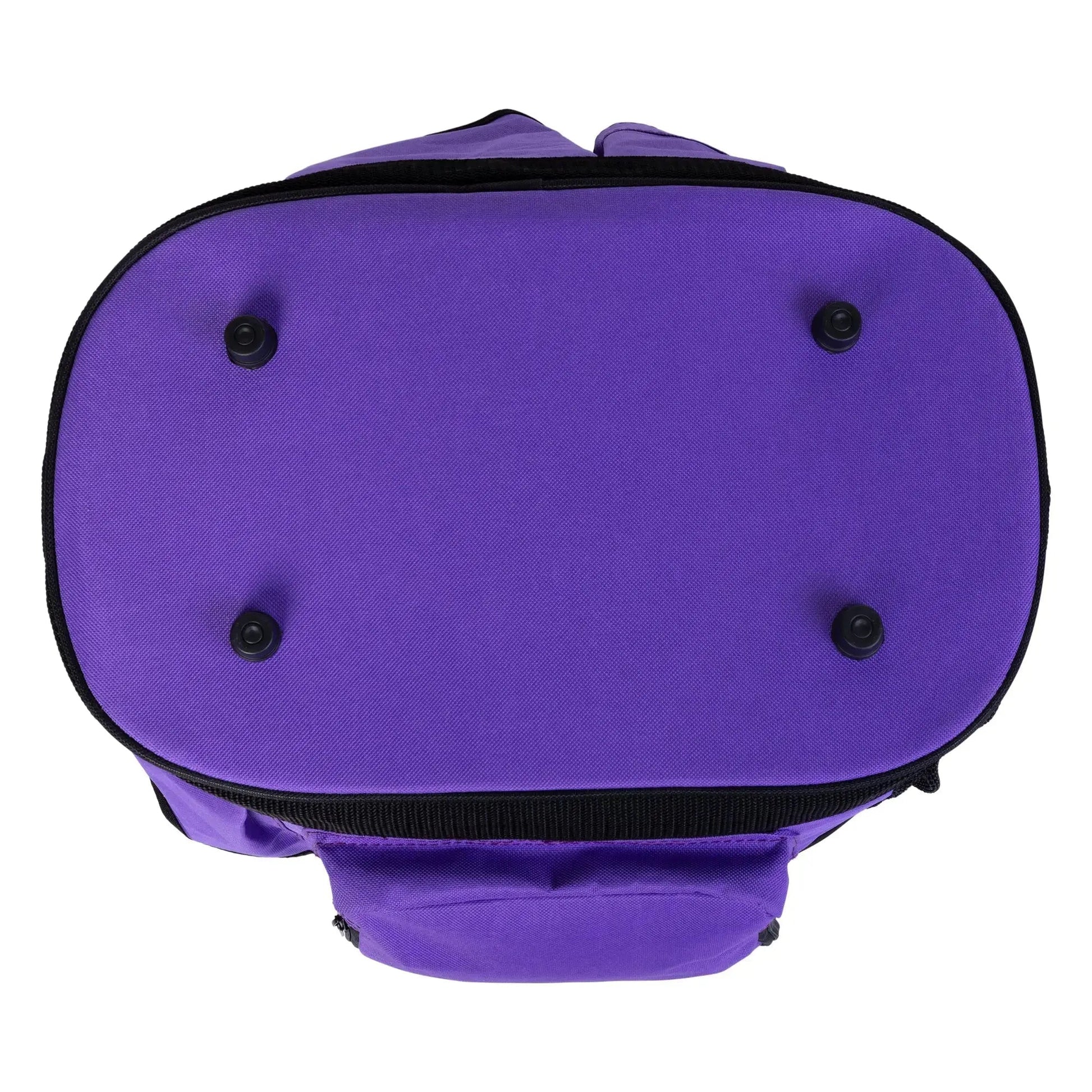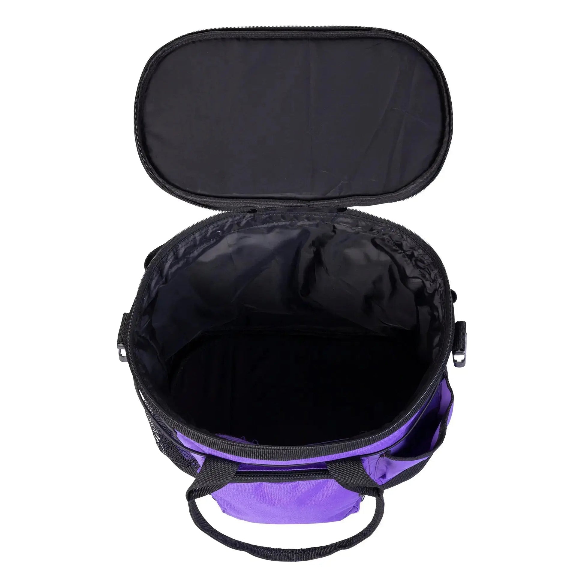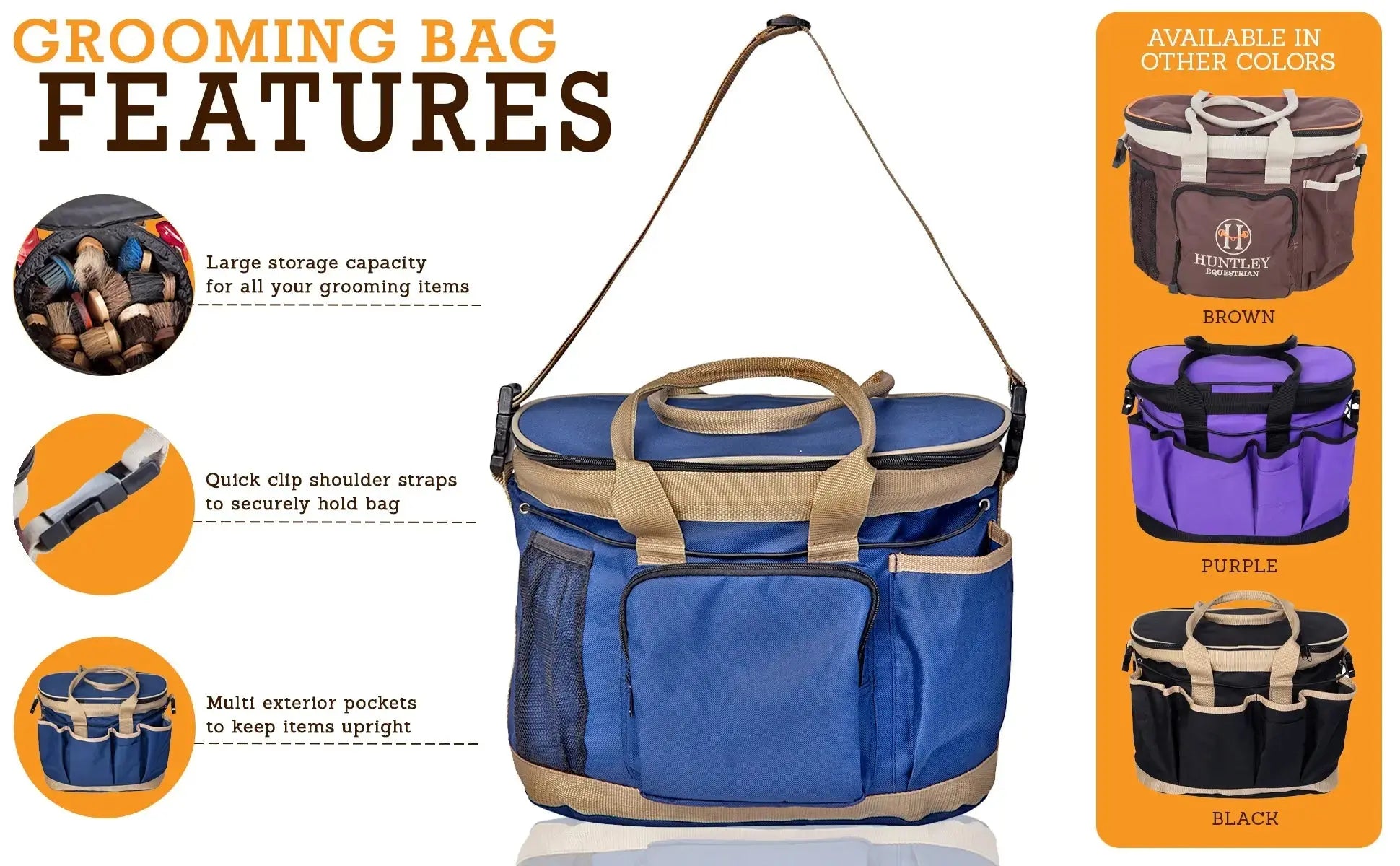 Huntley Equestrian Deluxe Grooming Bag Multi pocket, light weight brown nylon grooming bag designed to hold all of your grooming needs, complete with name label and pen holders inside. The deluxe bag features 9 various exterior pockets to hold bottles, brushes, hoof picks and other products. An elastic string is attached along the exterior to secure the products to the bag. Features include two durable nylon handles with a zippered closure, choice of quick clip shoulder straps. The straps will enable you to carry the saddle, bridle, and other objects while keeping your hands free. Zippered closure at the top keeps the inside storage dry and dust free. Inside zipper safety compartment for cell phone/money. Interior hard base to support products and able to fold for easy storage. Exterior studded base to keep off the ground and upright. This beautiful, well designed grooming bag is made of tough ballistic nylon for washability and extended years of use. Store your brushes here! Available in colors Black, Navy Blue, Brown, and Purple.