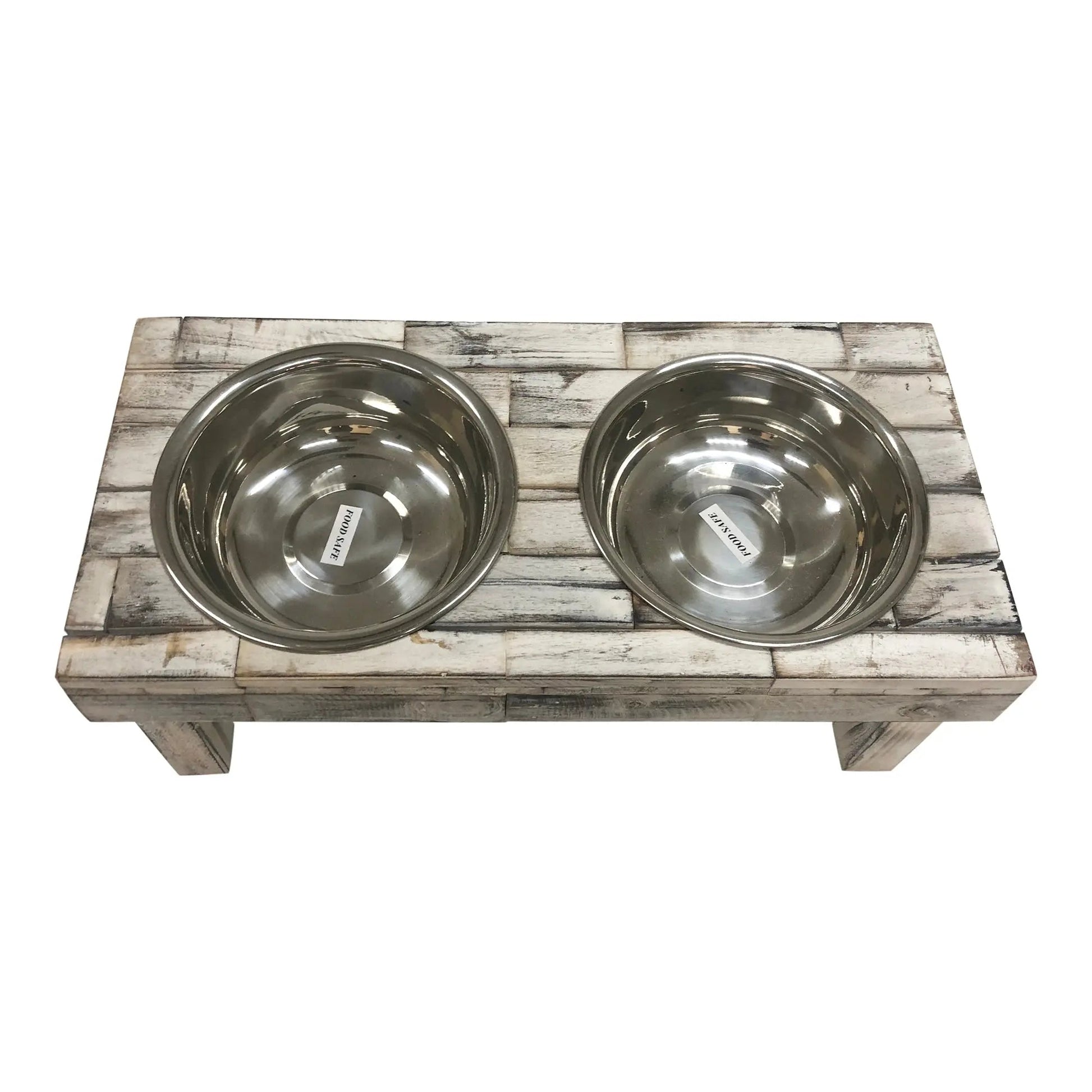 Huntley Pet Berjen Table Elevated Double Bowl Pet Feeder, White Wash. Huntley Pet offers a natural, modern design for dog and cat elevated double bowl feeders. These great looking double bowl feeders are constructed of reclaimed wood with natural finishes that compliment any decor. Huntley Pet Feeders focus on promoting healthy and happy pets by elevating the bows to reduce neck/joint stress. This elevated feeder experience will help with eating and indigestion. Huntley Pet feeders help keep the feeding environment clean by elevating the bowls off the ground, away from anything close to the floor. The Huntley Pet Feeders are offered in two sizes, Large and Small. The Huntley Pet feeder will add that special touch to any home decor while keeping your pet fed and watered safely. Large Feeders measure 21.25" Inches long x 10.25" Inches wide x 8.2" inches high, each stainless bowl holds 56 ounces, 7 cups. Small Feeders measure 17" inches long x 8 inches wide x 7.5" inches high, each stainless bowl holds 32 ounces, 4 cups.