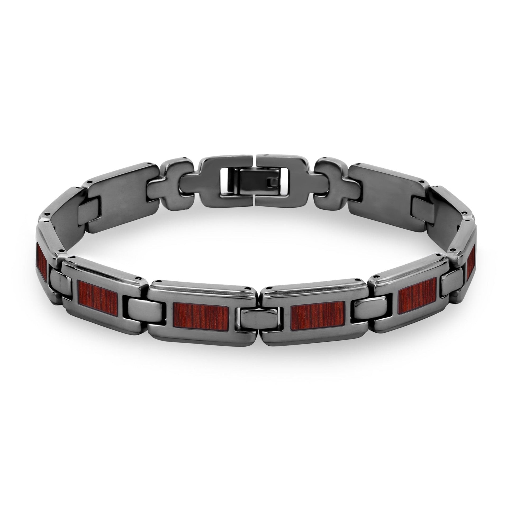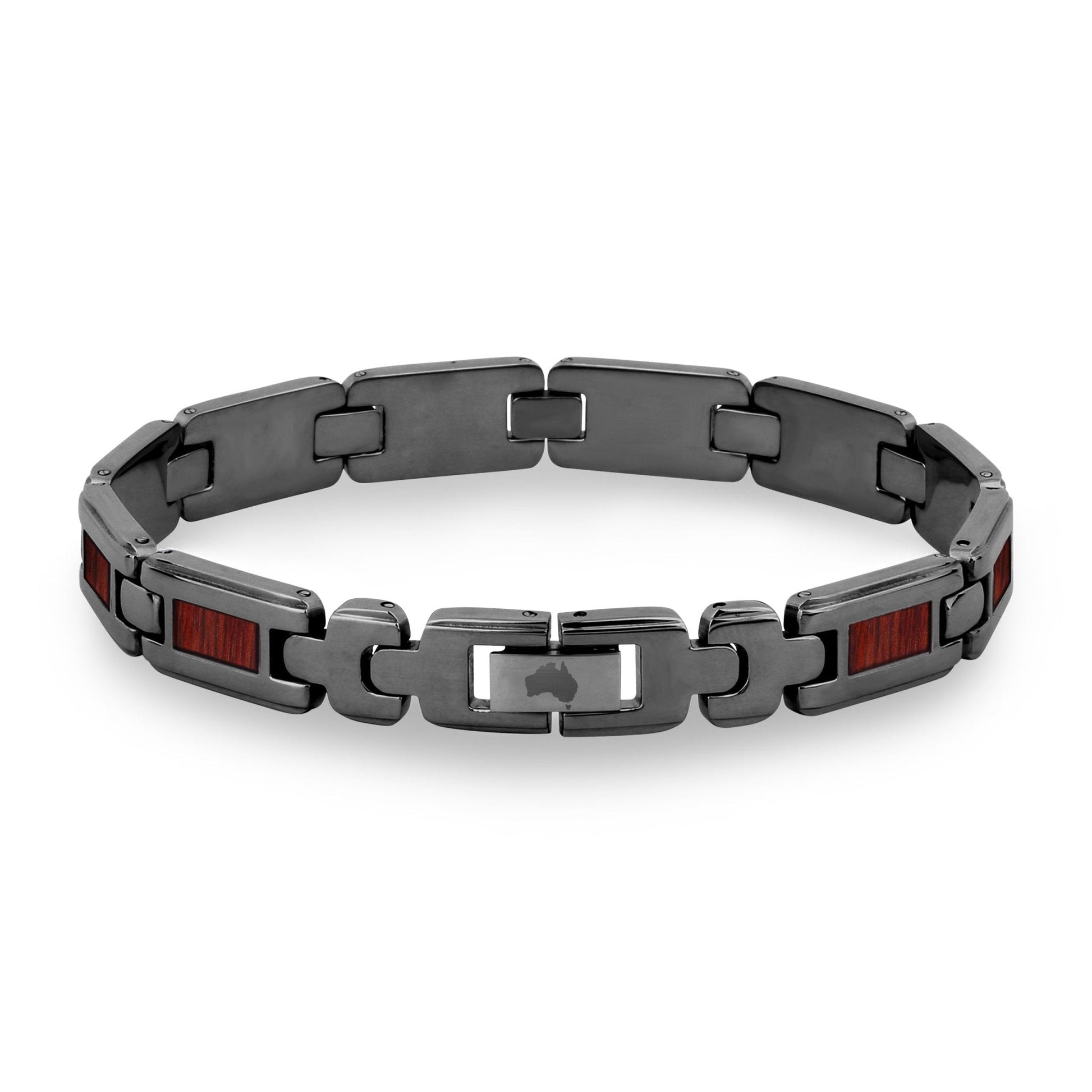 Men's gunmetal plated stainless steel link bracelet with Australian Jarrah wood inlays. Links are removable to adjust for size.
