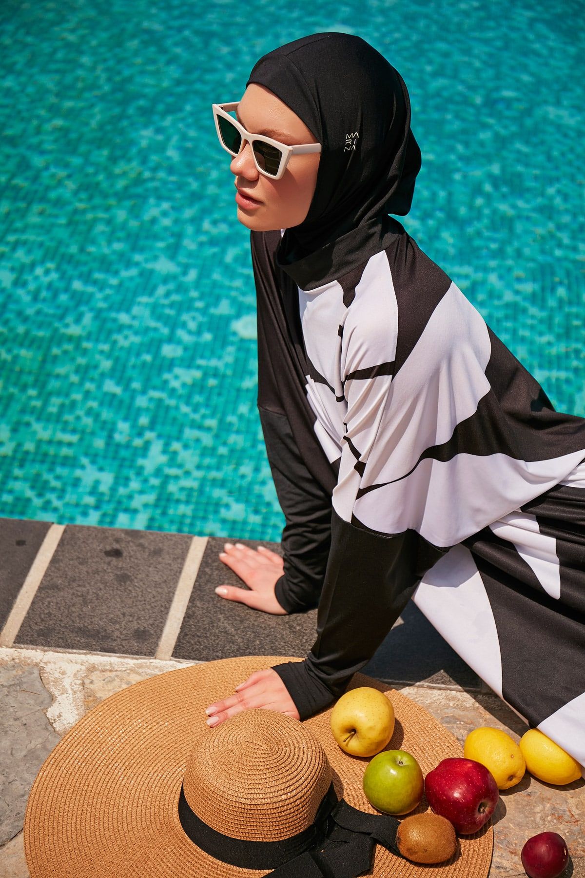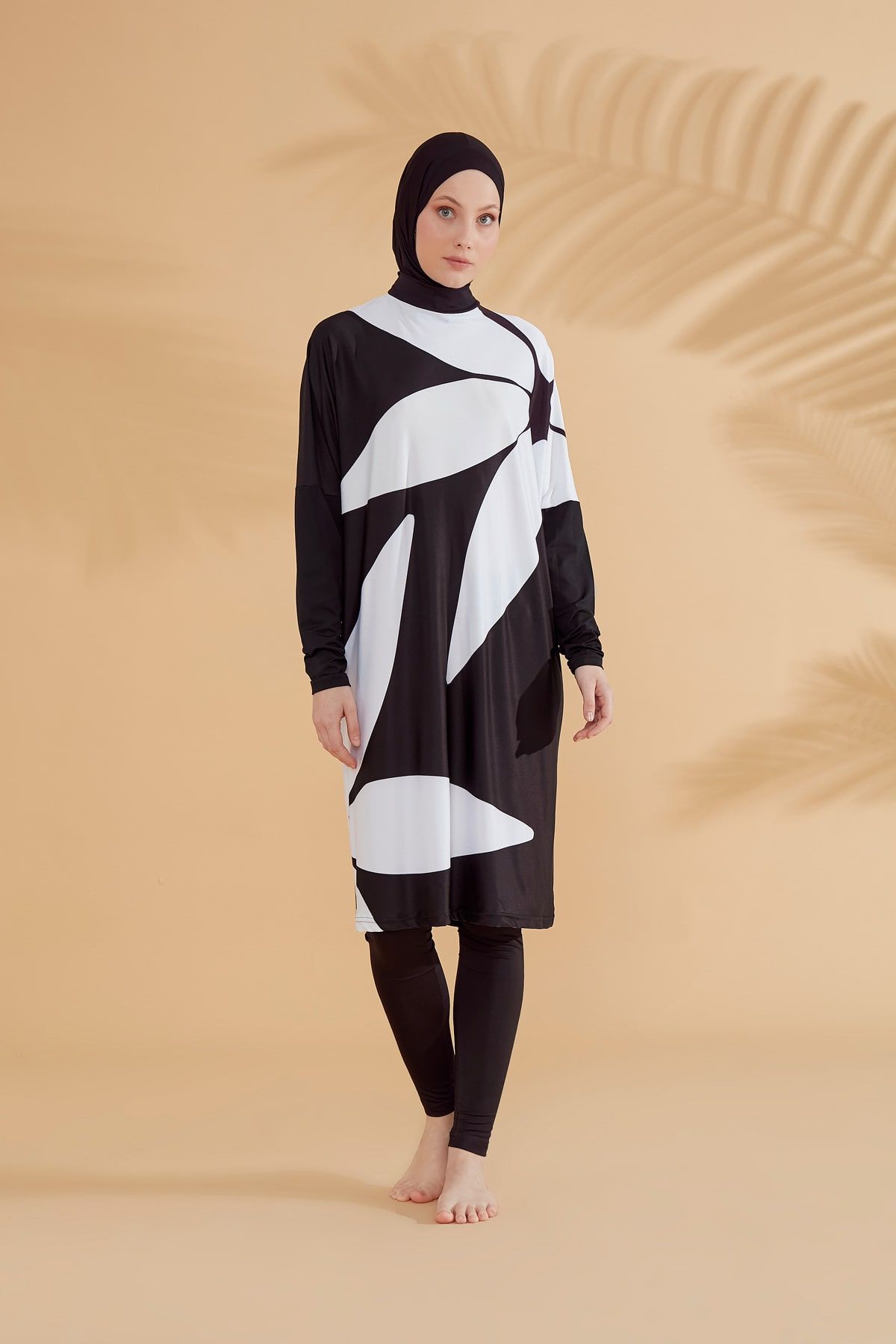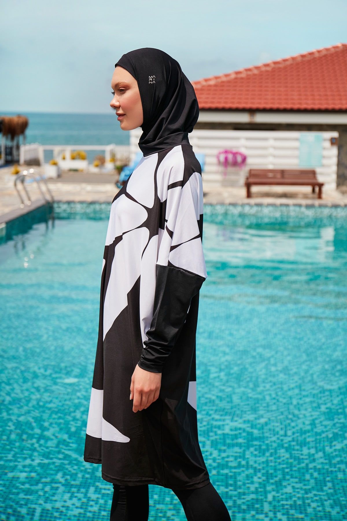 - The tunic, leggings, and swim cap are made from Lycra fabric.