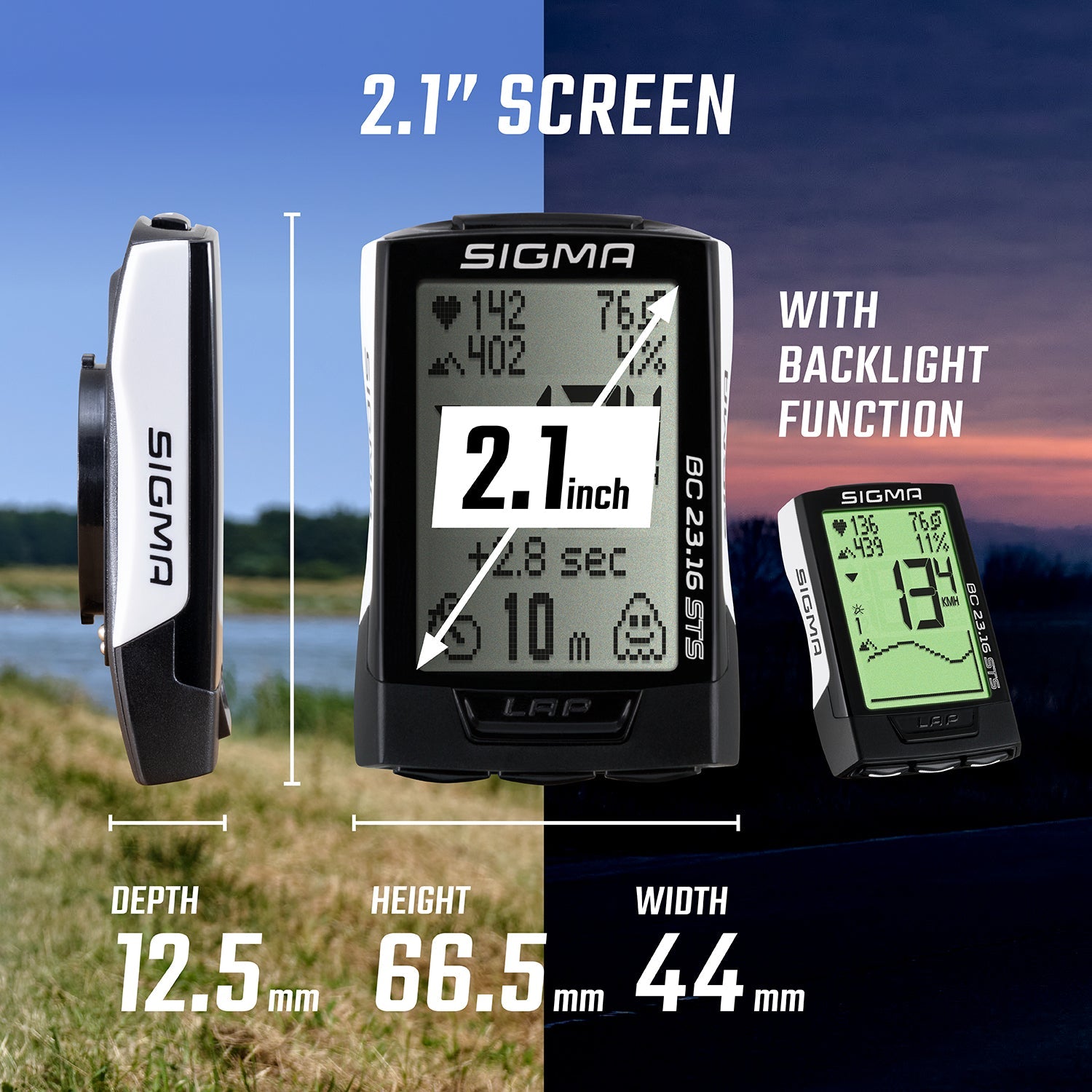 The BC 23.16 STS enables cyclists to keep an eye on all important bike, altitude, and heart rate functions. It creates an altitude profile and a heart rate graph. In addition to its temperature display and lap function, it shows current, average, and maximum cadence. All necessary transmitters are included in the scope of delivery.