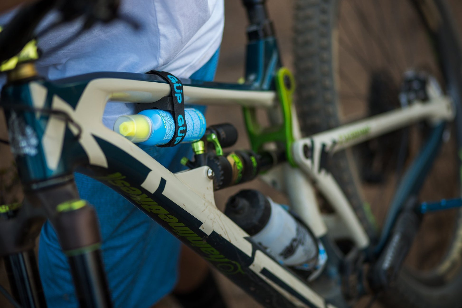 GUP (GÜP) Holster Strap allows you to carry your canister of GÜP securely on your bicycle while protecting the frame from rub marks. Silicon rubber buckle allows an anti-slip factor for the canister. Enhance your cycling experience with the GUP Holster Self-Fastening Hook and Loop Strap, specially crafted to securely hold a GUP sealant canister on your bike frame or seatpost. Whether you're hitting the trails or cruising through the city, this strap ensures your GUP sealant canister stays in place; ready to handle any unexpected punctures. Crafted from durable materials, the long Holster strap offers a snug fit without scratching your bike's paint. Its adjustable closure makes it compatible with a wide range of frame sizes, tube shapes, and seatposts, providing a custom fit that won't slip or loosen during your ride. Forget about bulky mounts or complicated installations—our Holster strap is designed for simplicity and efficiency. Just wrap it around your frame, secure it with the self fastener, and you're ready to go. It's that easy! Compact and lightweight, this strap adds minimal weight to your bike while offering maximum functionality. It's the perfect accessory for cyclists who prioritize safety and preparedness on every ride. Secure your spare tubes or additional tools as well if desired. Ensure your GUP sealant canisters are always within reach with our reliable Holster Hook and Loop Closure Strap. Whether you're a casual rider or a seasoned cyclist, you can count on this strap to keep your sealant secure and your ride smooth. Order yours today and enjoy peace of mind on every journey!Secure Attachment: Designed specifically for GUP sealant canisters, ensuring they stay firmly in place during rides whether on gravel bike, mountainbike, e-mtb, road, ebike, commuter, or e-bike.Universal Fit: Adjustable Hook and Loop Closure strap fits all standard bicycle frames, seatposts and tubes, providing versatile mounting options. Wraps around triathlon bike aero seatposts and thicker bike framesDurable Construction: Made from high-quality materials for long-lasting use and reliability in various weather conditions. Custom rubber non-slip grommet holds products securely in place.Easy Installation: No extra tools required; simply wrap around the frame or seatpost and secure tightly with self fastening closure for instant setup. Great for any extras you want to carry on the bike and not in pockets.Compact and Lightweight: Adds minimal bulk to your bike while offering maximum utility for carrying sealant canisters.Essential Accessory: Ideal for cyclists who prioritize safety and convenience on their rides.
