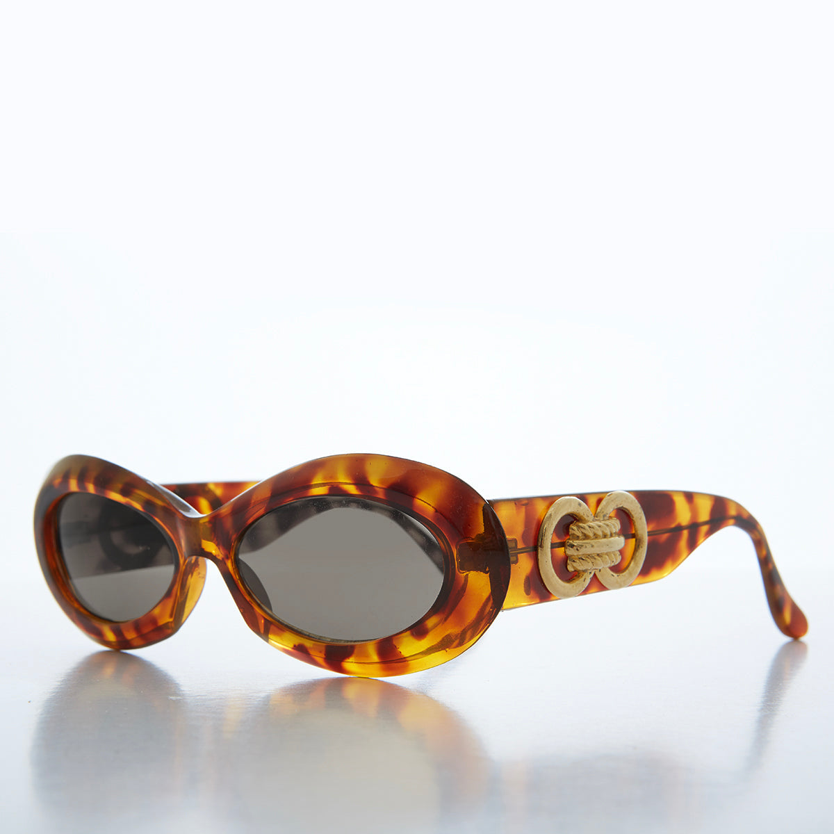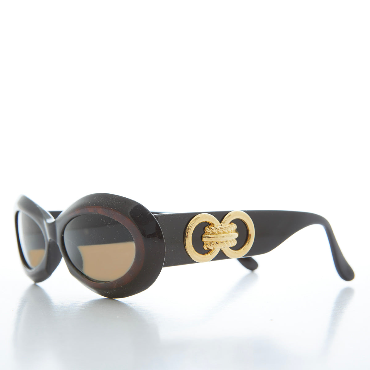 These regal 90s sunglasses feature a chunky oval frame with gold bling temple accents. New old stock. Never worn. Great condition. UV protection.