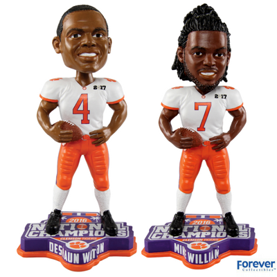These bobbleheads feature Deshaun Watson and Mike Williams, former quarterback and wide receiver for the Clemson Tigers, on a 2016 National Champions Base. It commemorates the 2017 NCAA College Football Playoff National Championship Game victory over the Alabama Crimson Tide. They are officially licensed by Clemson University and the NCAA.