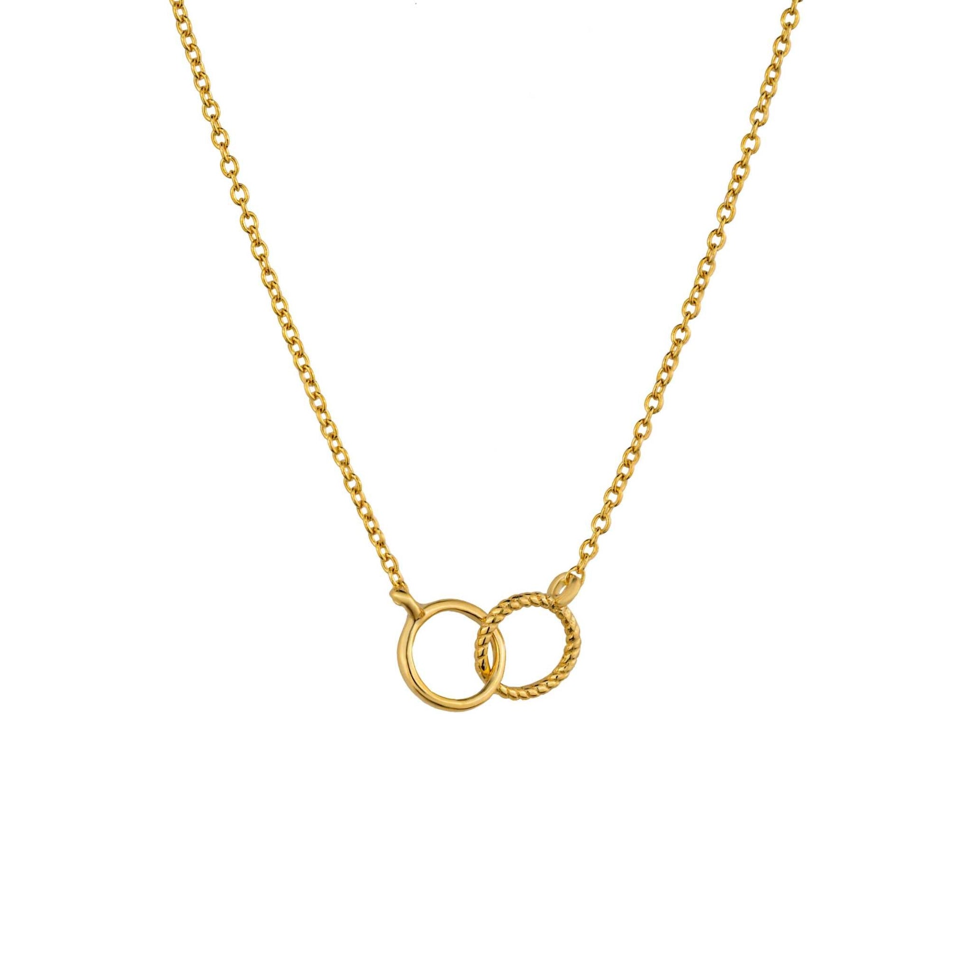 Symbolizing the eternal bond of love and friendship, this interlocking circles necklace is a timeless jewelry piece. Crafted in 100% recycled 925 Sterling Silver and dipped in 14k gold, this dainty necklace features one ring with a smooth finish and a second ring with a subtle twisted design.