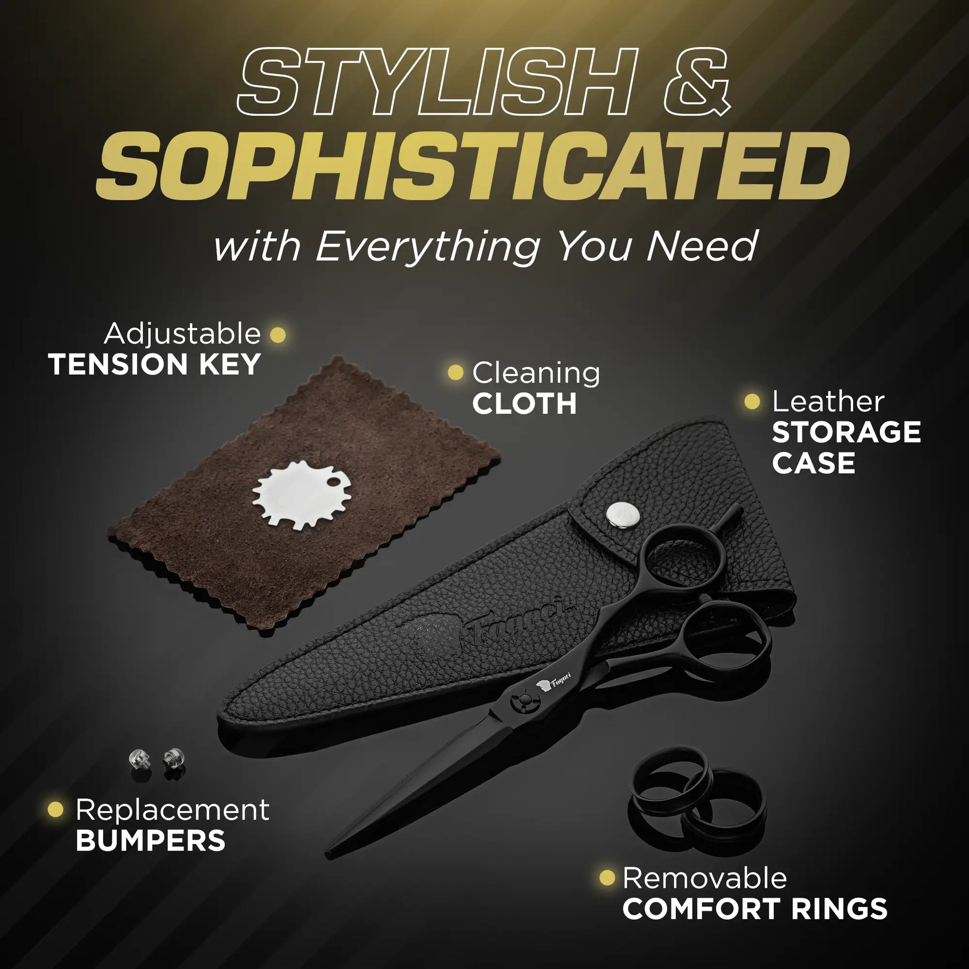 - ALL ESSENTIALS INCLUDED - These professional hair scissors come with a blade tension key, safety sheath, cleaning leather, comfort rings, and spare bumpers for optimal maintenance.