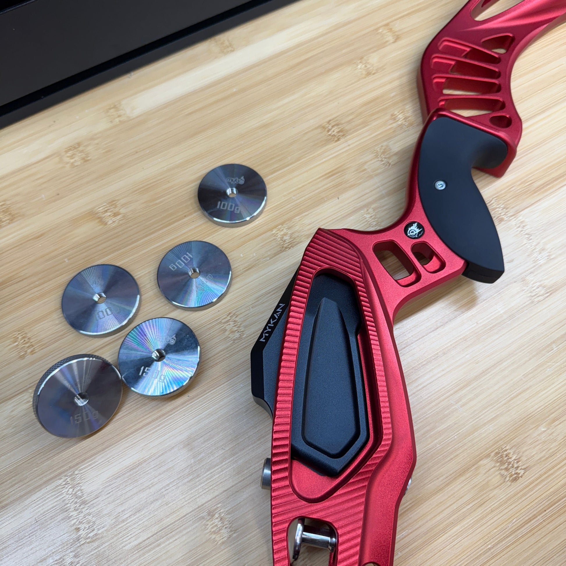 Includes the 350g weight that can be bolted into the riser as well as several 150g and 100g disc weights from Mybo as well.