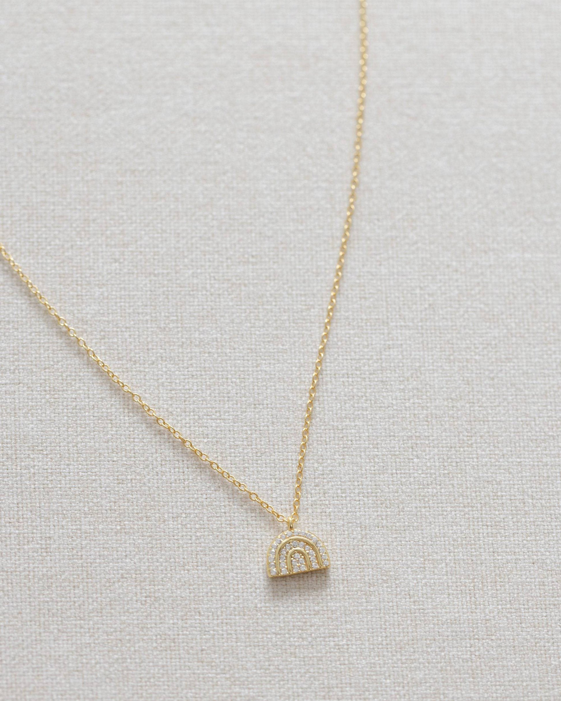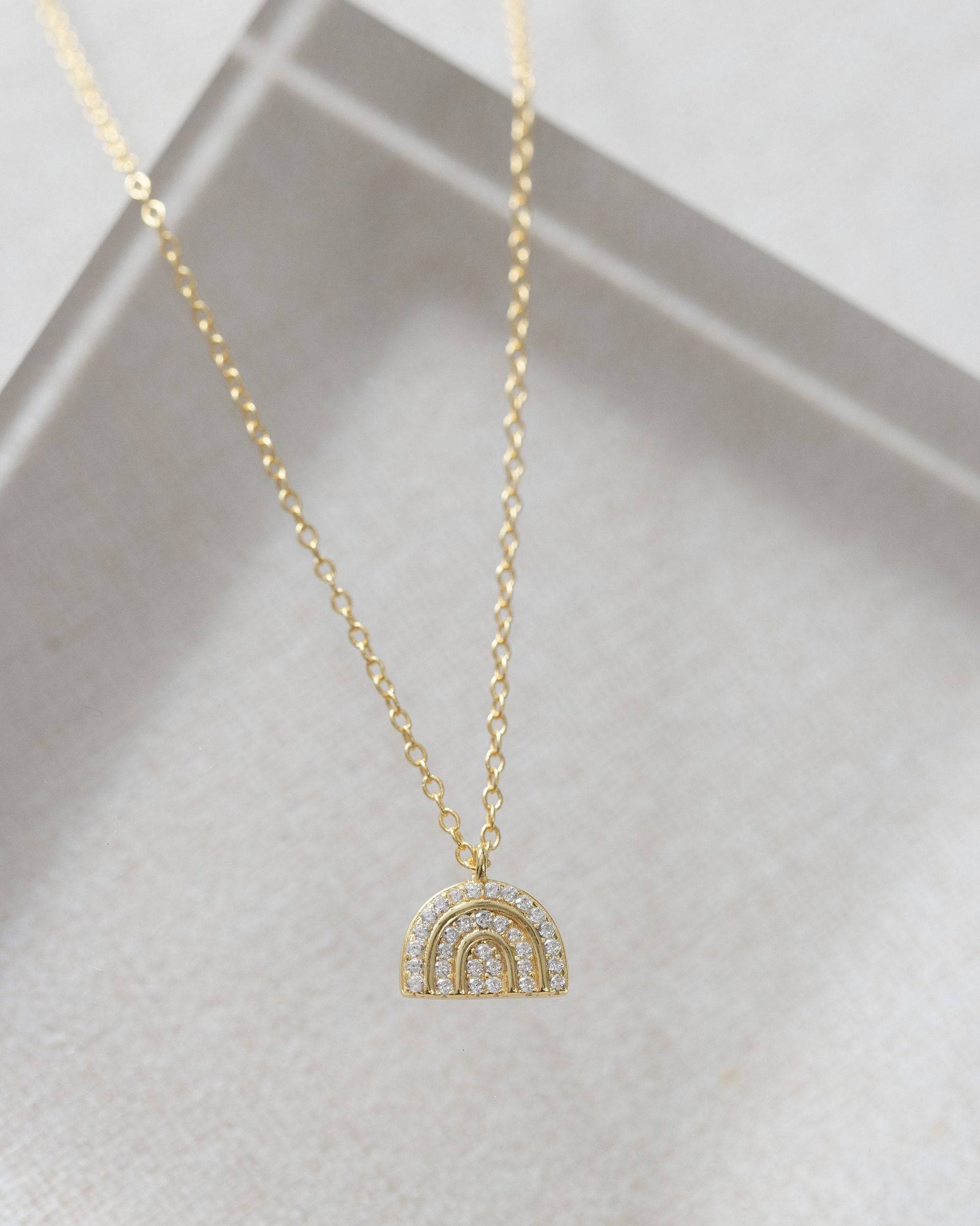Enhance your style with our Crystal Rainbow Necklace. The dainty rainbow charm is studded with brilliant moissanite crystals, set in 14k gold vermeil. The adjustable chain ensures a perfect fit.