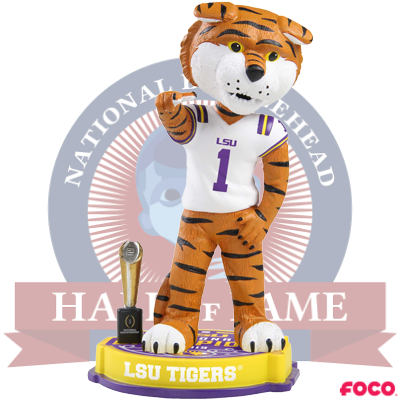 This bobblehead features Mike the Tiger, mascot of the LSU Tigers, on a 2019 National Champions base with a replica National Championship Trophy. It commemorates the 2020 NCAA College Football Playoff National Championship Game victory over the Clemson Tigers, which made LSU the 2019 National Champions. It is officially licensed by Louisiana State University and the NCAA.