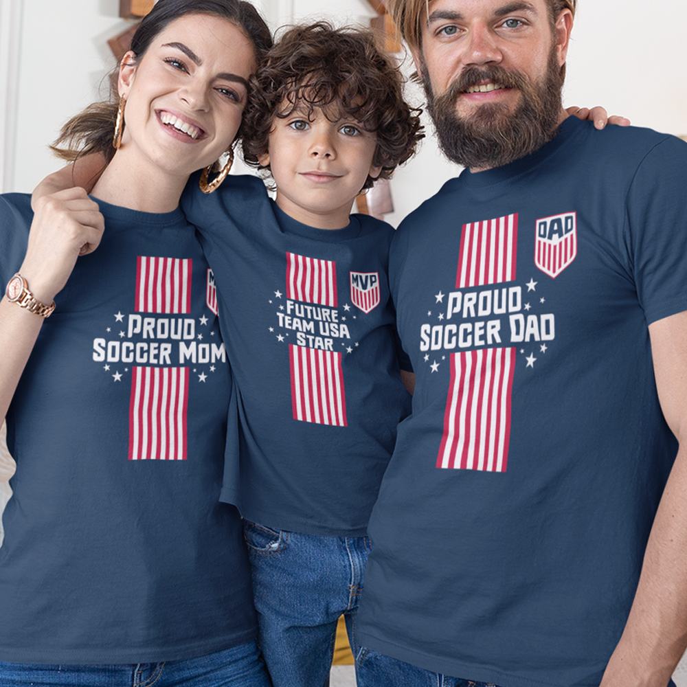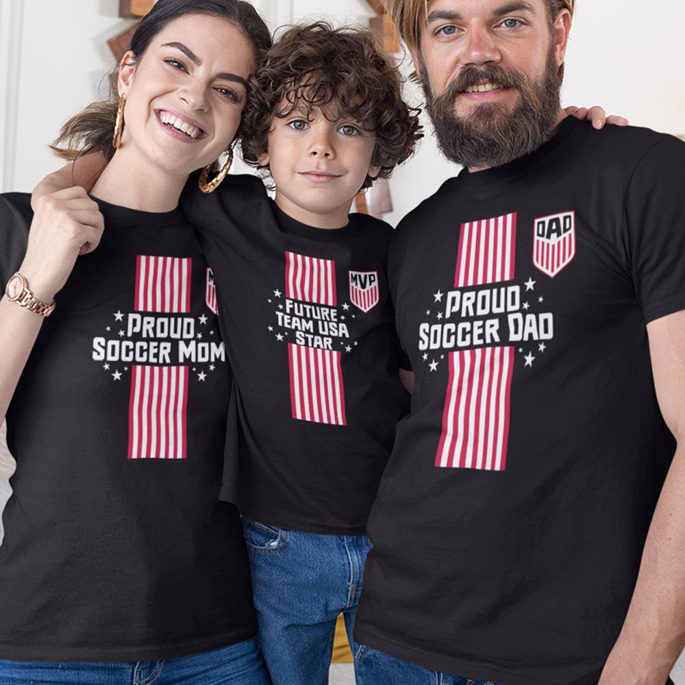 Proud Soccer Dad, Proud Soccer Mom, Future Team USA Star Dad Mom and Kid Matching Organic Cotton T-Shirts Family Set (Set of 3)