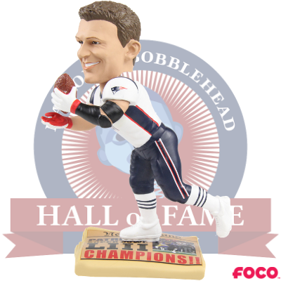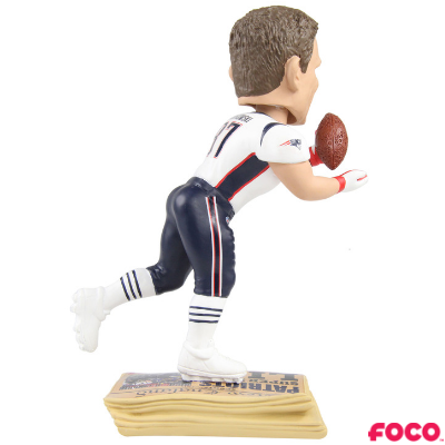 This bobblehead commemorates Rob Gronkowski's incredible 29-yard diving touchdown catch in Super Bowl LIII. Tom Brady connected with Gronkowski midway through the 4th quarter of the tied game between the Patriots and Rams. The touchdown put the Patriots up 10-3. Gronkowski retired following the season making this his last NFL game. It is officially licensed by the New England Patriots and the NFL.