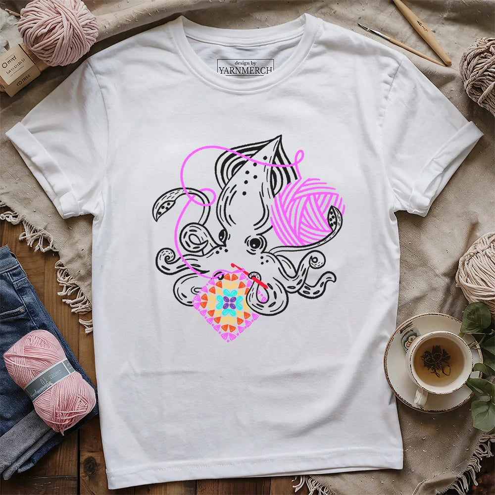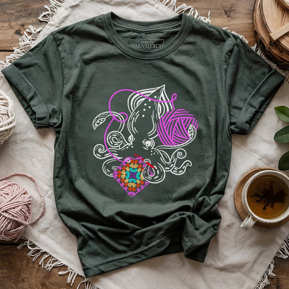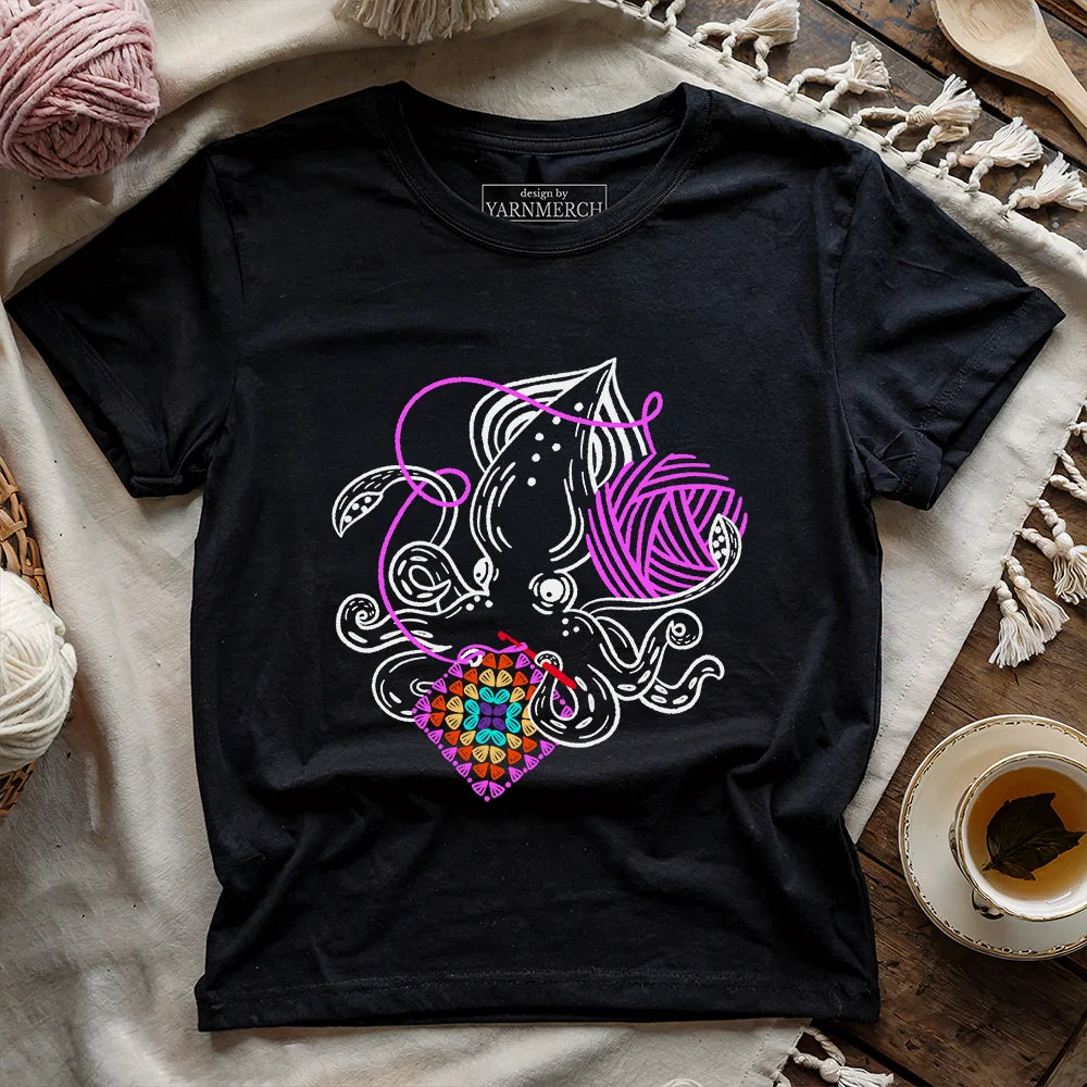 This bold black tee dives into creativity with a stunning squid illustration wrapping around a vibrant ball of yarn, its tentacles weaving through a colorful crochet granny square. Perfectly quirky and artistic, it’s a playful nod to both marine life and crochet magic – because crafting with many “hands” is always better!