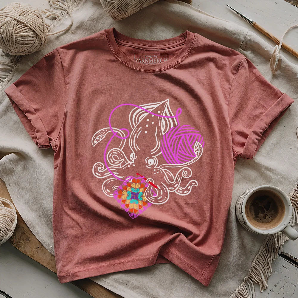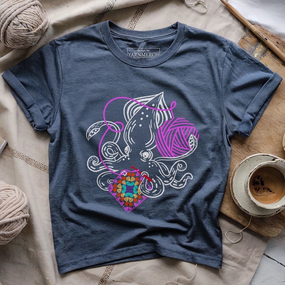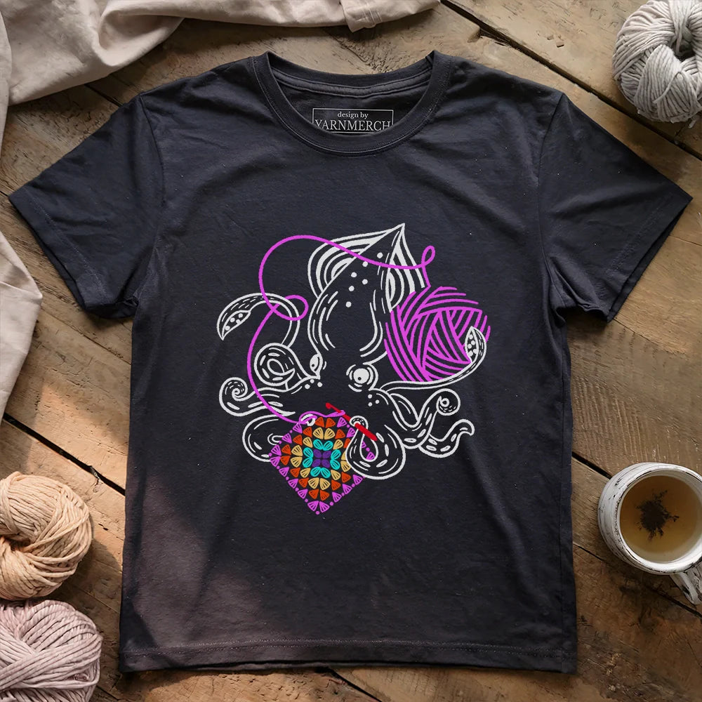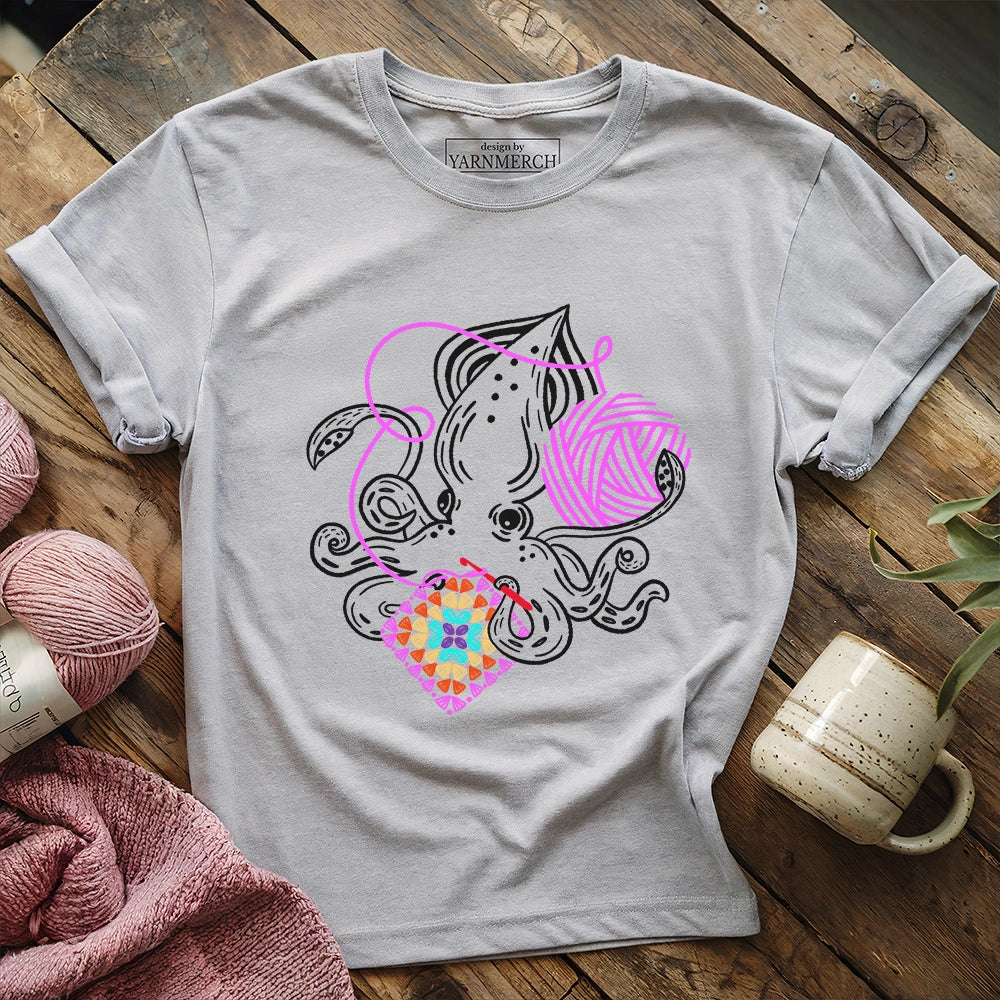 This bold black tee dives into creativity with a stunning squid illustration wrapping around a vibrant ball of yarn, its tentacles weaving through a colorful crochet granny square. Perfectly quirky and artistic, it’s a playful nod to both marine life and crochet magic – because crafting with many “hands” is always better!