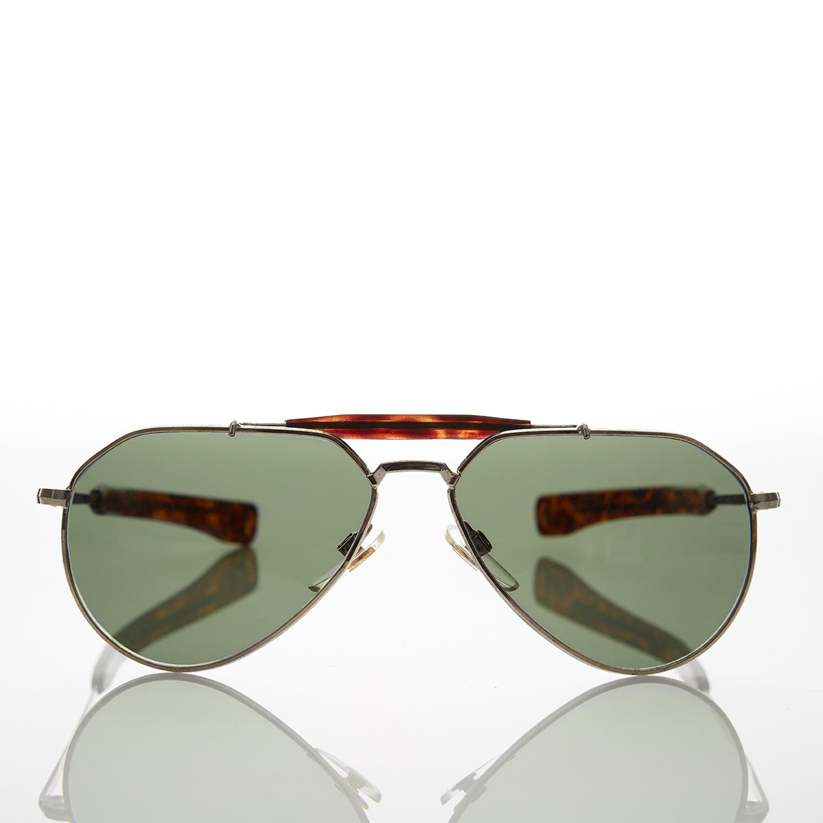 Attractively shaped vintage aviator pilot sunglass. Quality nickel silver metal frame with optical ground and polished impact resistant glass lens. Comfort brown tortoiseshell paddle tips and brow bar. A true American vintage classic, never out of style. Optical quality frame.