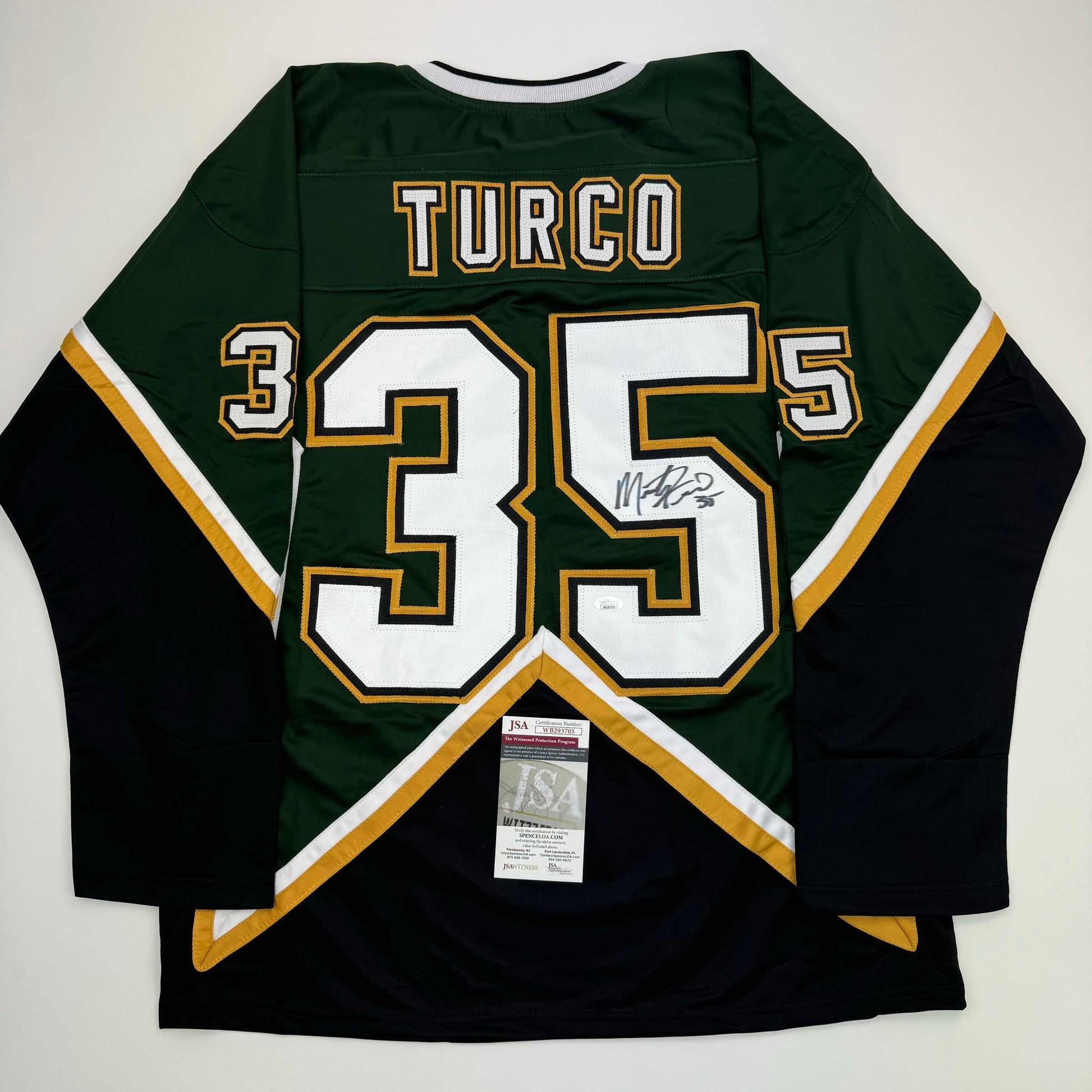 Autographed/Signed Marty Turco Dallas Green Hockey Jersey JSA COA