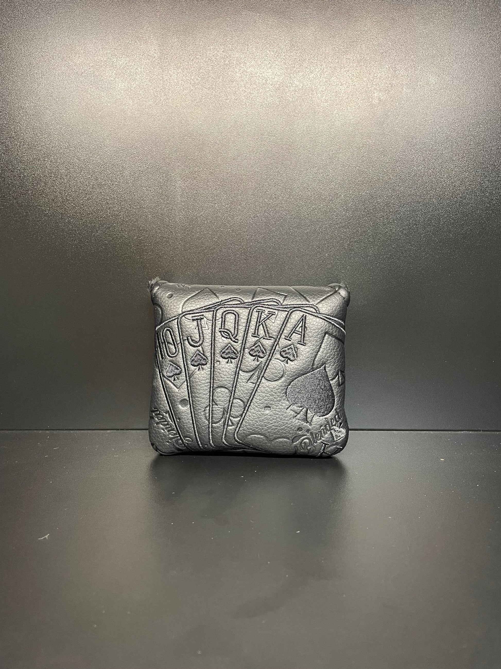 The Blackout Royal Flush headcover is a bold, sleek, and sophisticated golf accessory that brings a bit of high-stakes poker flair to the golf course. Featuring a minimalist, "blackout" design, it combines a modern aesthetic with the iconic symbolism of a royal flush, making it perfect for golfers who want their gear to stand out with style and confidence.