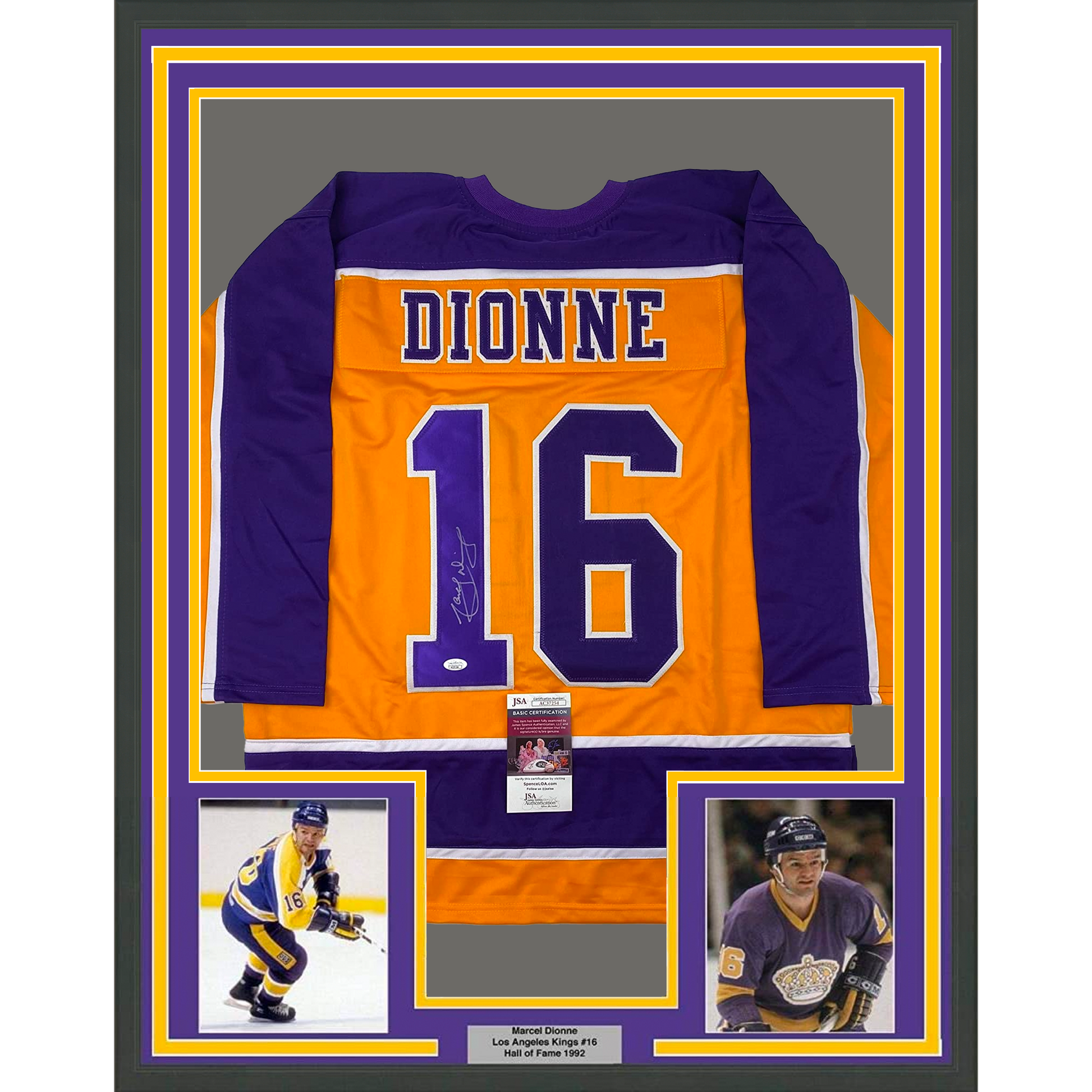 Framed Autographed/Signed Marcel Dionne 35x39 Los Angeles LA Yellow Hockey Jersey JSA COA
