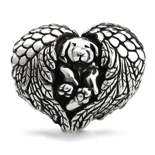 OHM acknowledges that your angel holds a special place in your heart with this beautiful silver bead, a heart made of angel wings. And nestled in the fold of those wings -- perhaps protected by them or perhaps the angelic bearer of these magnificent pinions -- your angel pup snuggles at the center of your love.