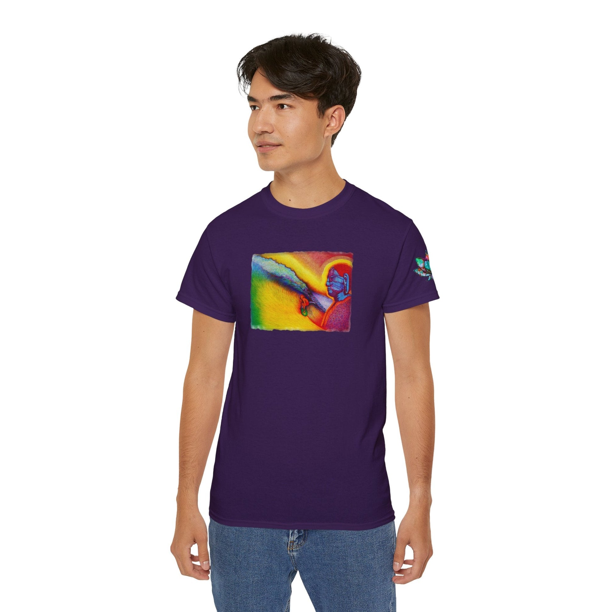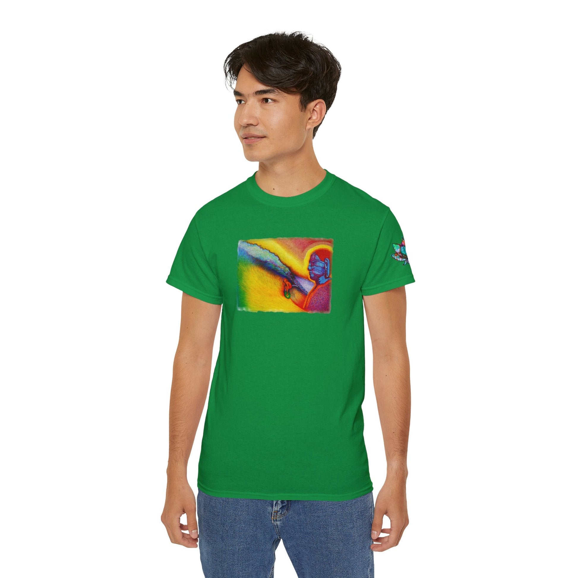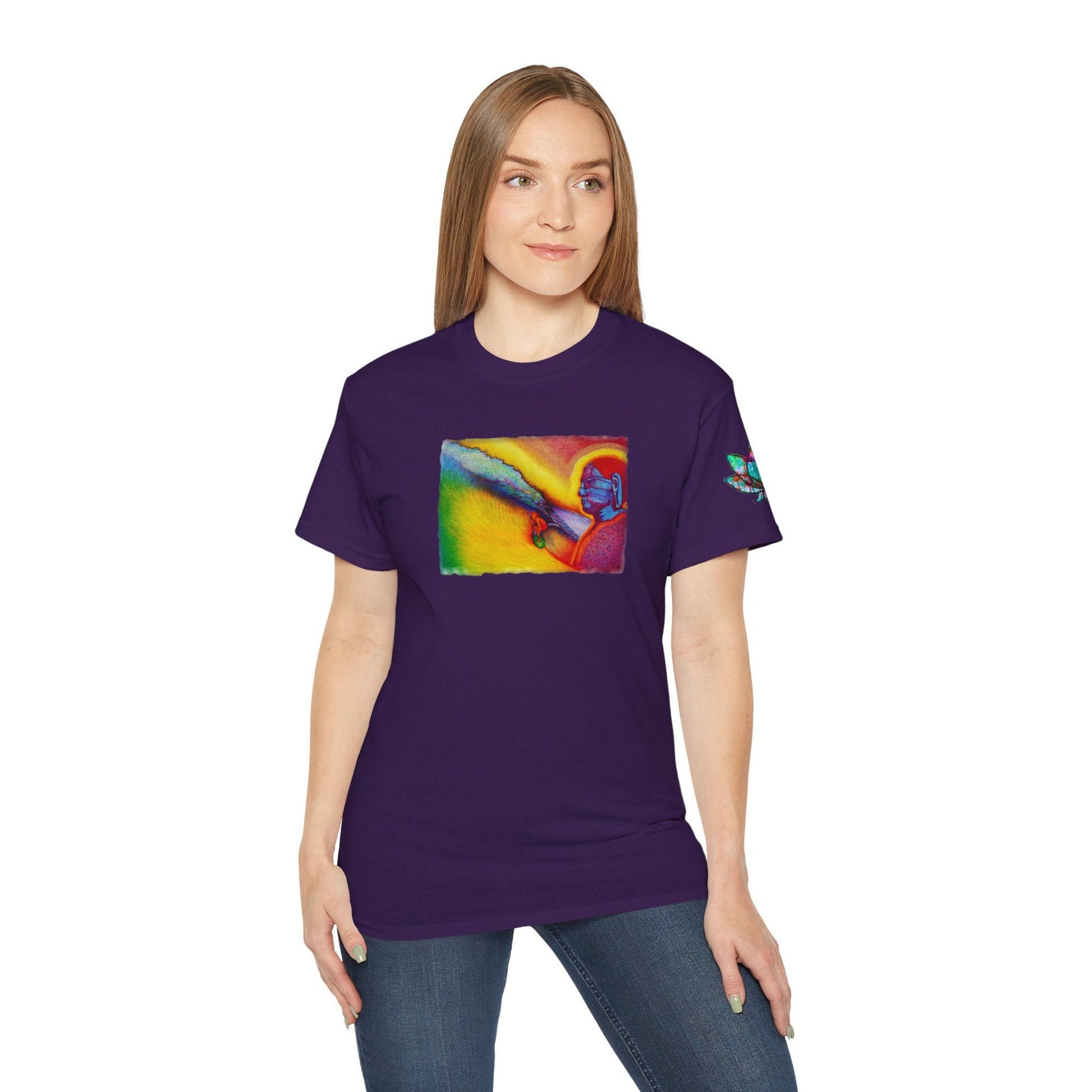 This unisex ultra-soft cotton tee is a classic. The shoulders are tapped for a good upper-body fit. There are no side seams, ensuring a clean, unbroken flow. The collar has ribbed knitting for improved elasticity. The materials that went into this product are sustainably sourced and economically friendly. This is a high quality tee, make no mistake about that. You'll love the original fine mixed-media art piece prints.