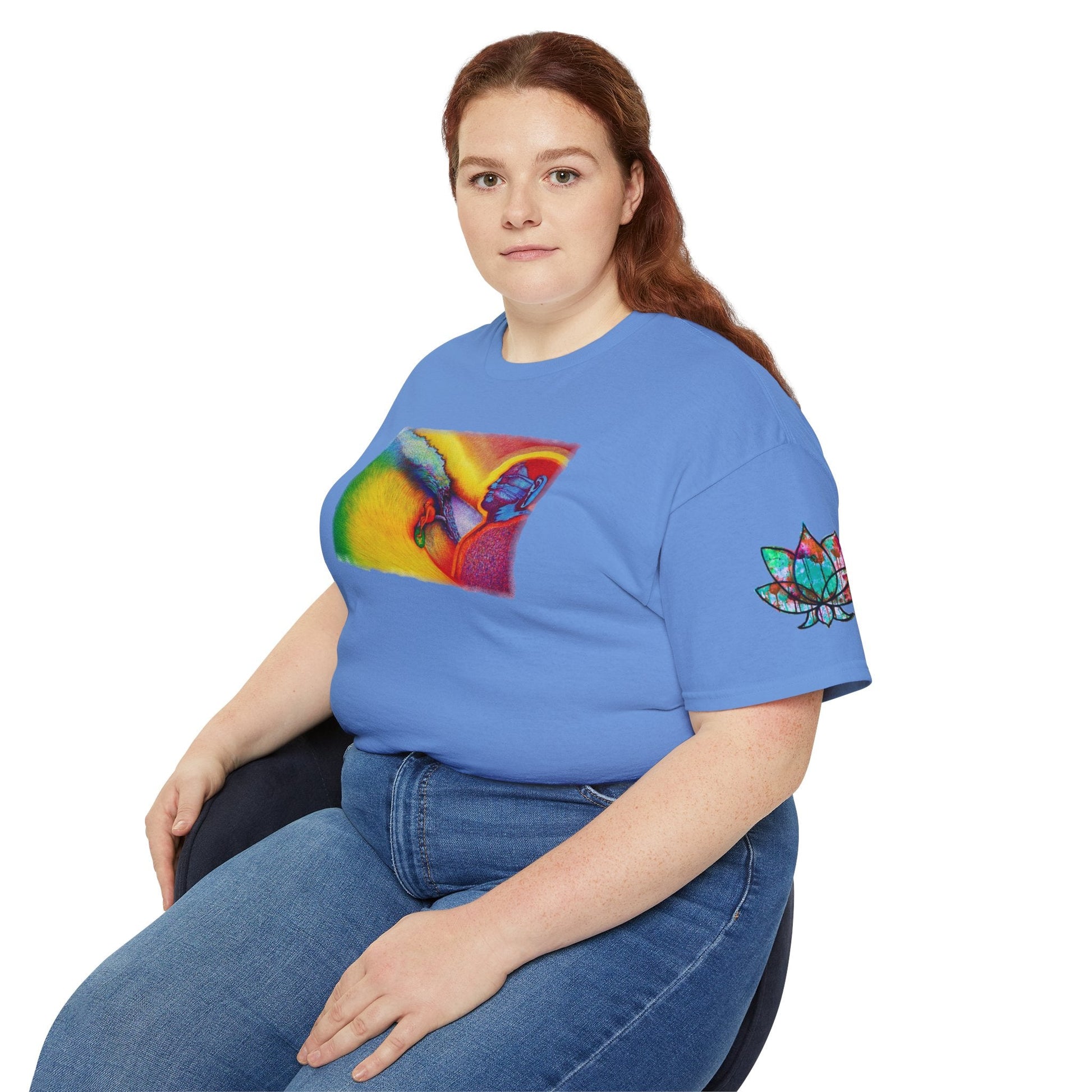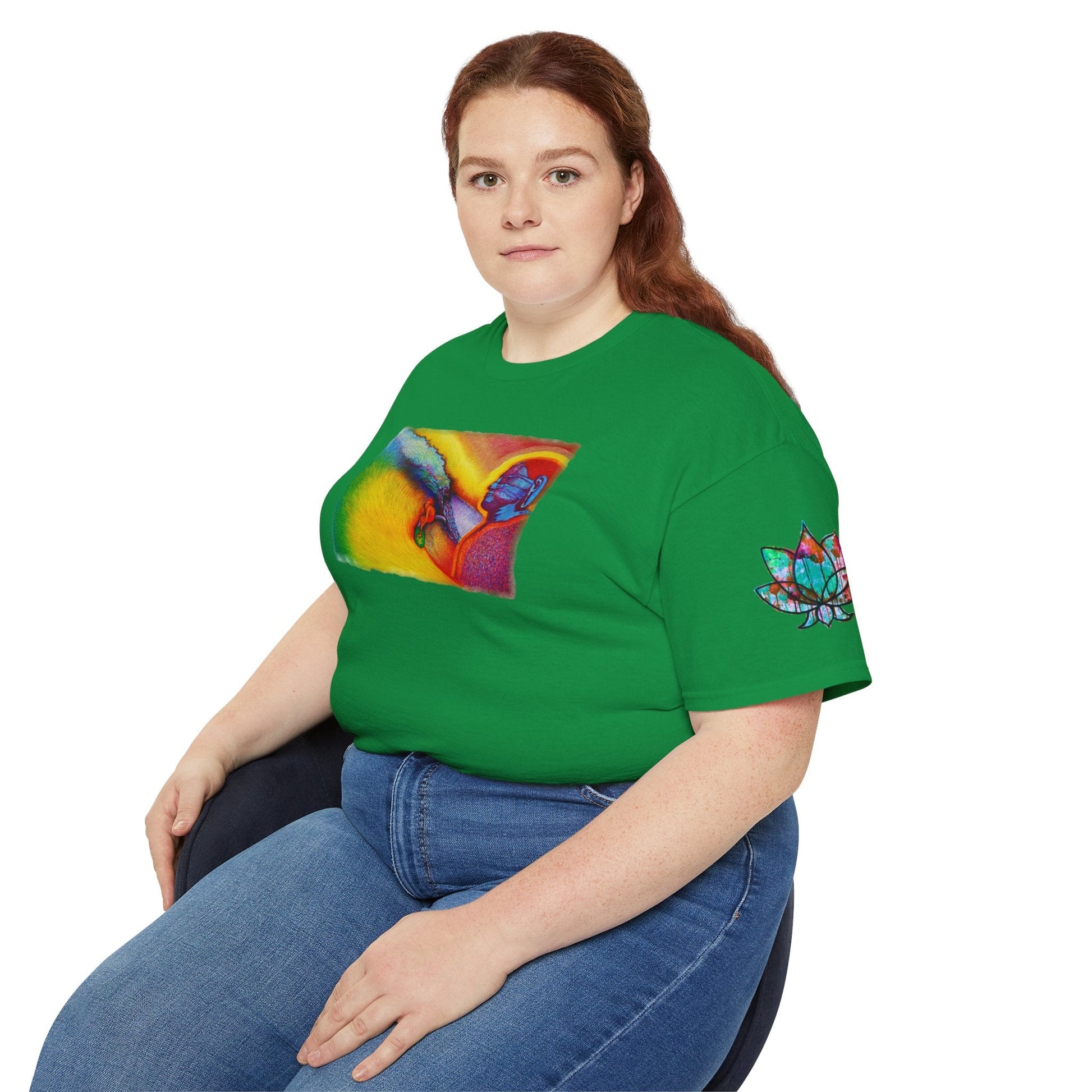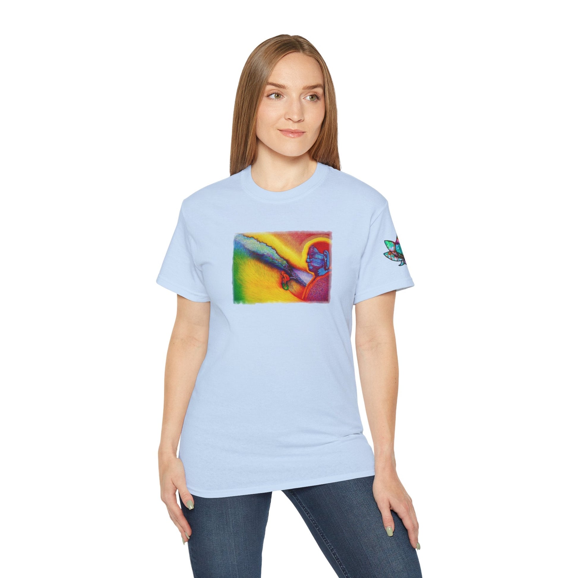 This unisex ultra-soft cotton tee is a classic. The shoulders are tapped for a good upper-body fit. There are no side seams, ensuring a clean, unbroken flow. The collar has ribbed knitting for improved elasticity. The materials that went into this product are sustainably sourced and economically friendly. This is a high quality tee, make no mistake about that. You'll love the original fine mixed-media art piece prints.
