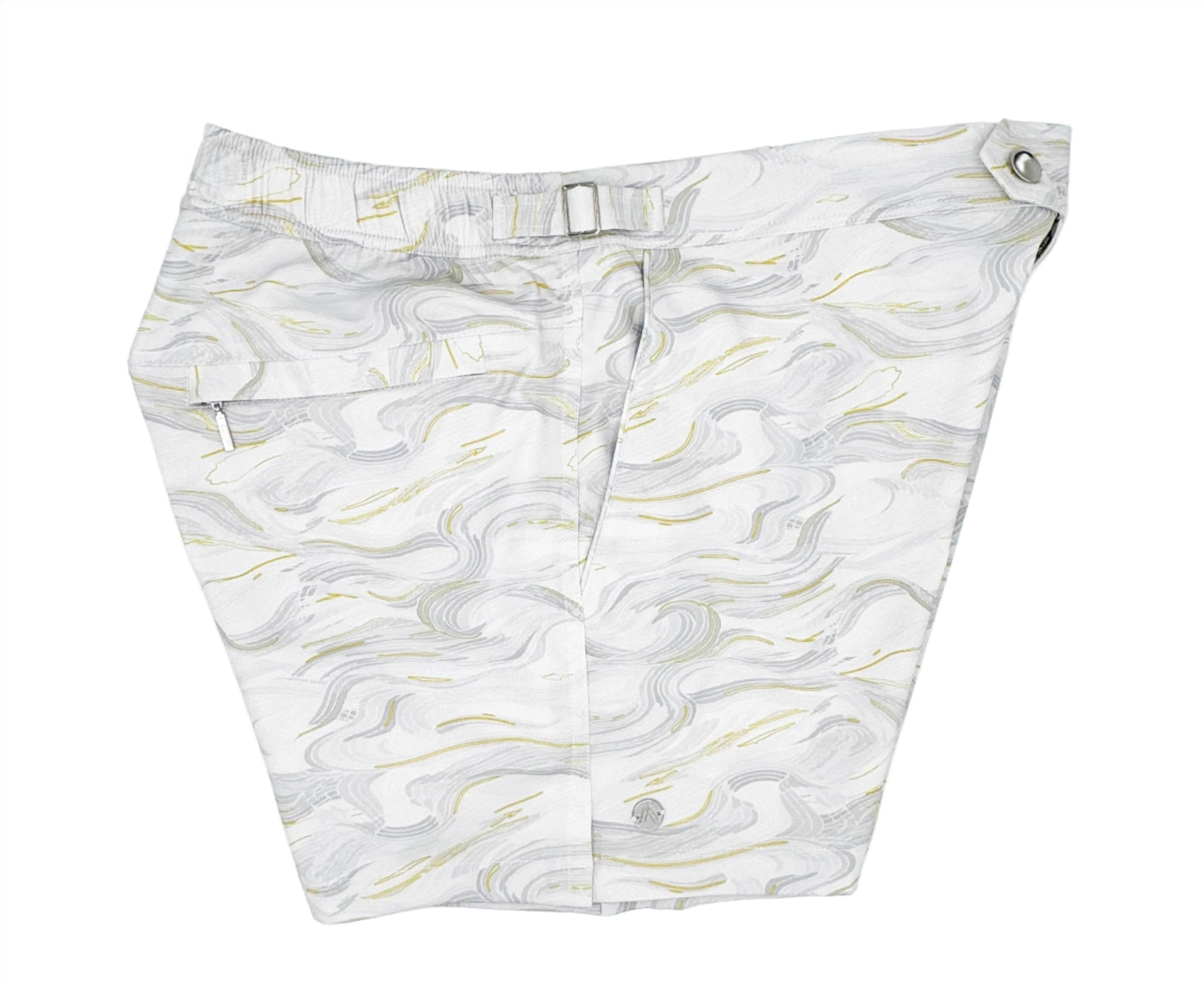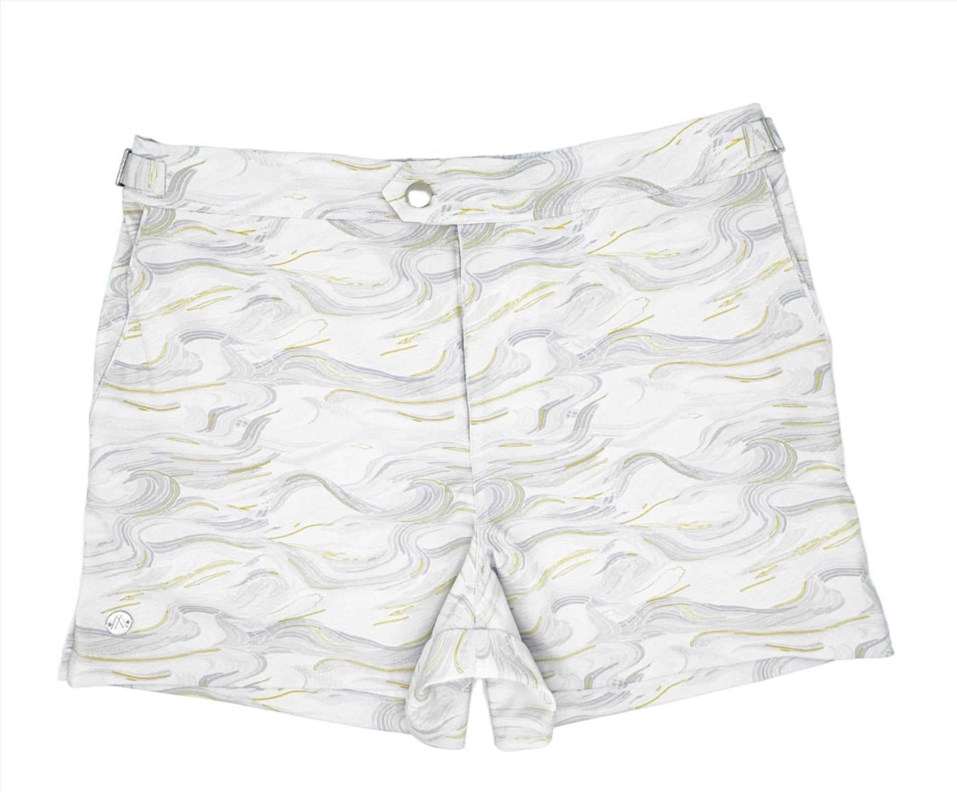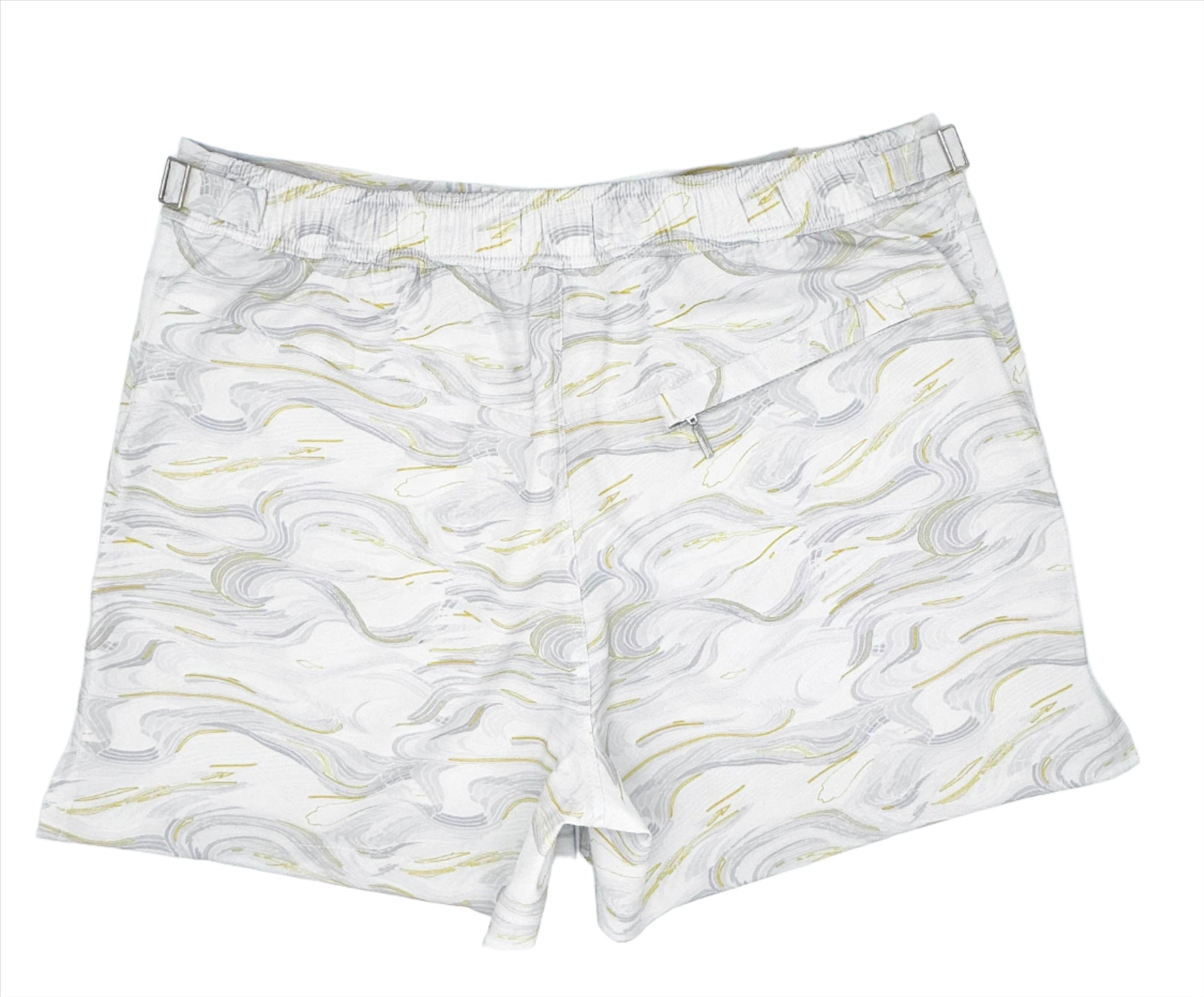The Restless Swim Short: Our take on the resort short has a flattering, modern fit and borrows luxe details from gentleman’s tailoring, including a tab button closure and side tabs. The back pocket zippers shut, and there the mesh pockets ensure water drains and the trunk keeps its shape when you're swimming. The 5 inch inseam hits mid-thigh, and are intended to look equally chic whether you're at a pool party or stepping out to dinner. Fits true to size. Relaxed slim fit, with 5 inch inseam short length.