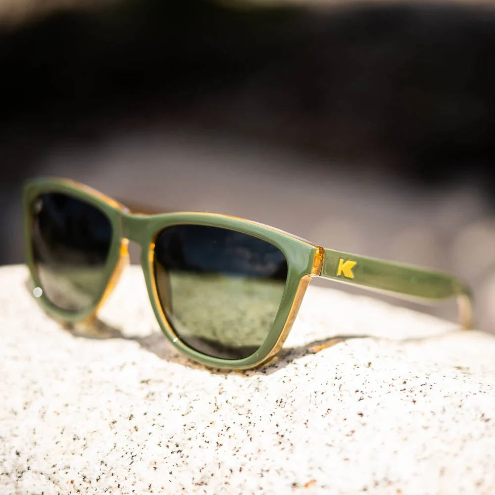 If you’re feeling that call of the wild urging you to faraway places, take these army green shades with you. Knockaround Premiums are the sunglasses we love to brag about, and in this color combination they’re like an untamed desert landscape daring you to take them on. An army green exterior is complemented by the amber interior on the frames, and the addition of the polarized aviator green lenses makes for one good looking pair of shades.