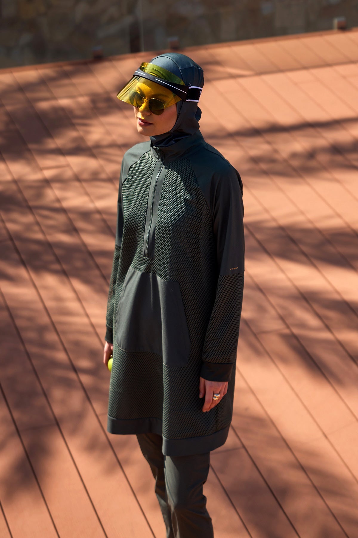 Marina’s M2534-3 khaki swimwear redefines modest swimwear with bold design elements including elegant tulle overlays and functional side pockets. The 90 cm tunic length and advanced fabric technology offer both performance and sophistication for women who demand more than just swimwear.