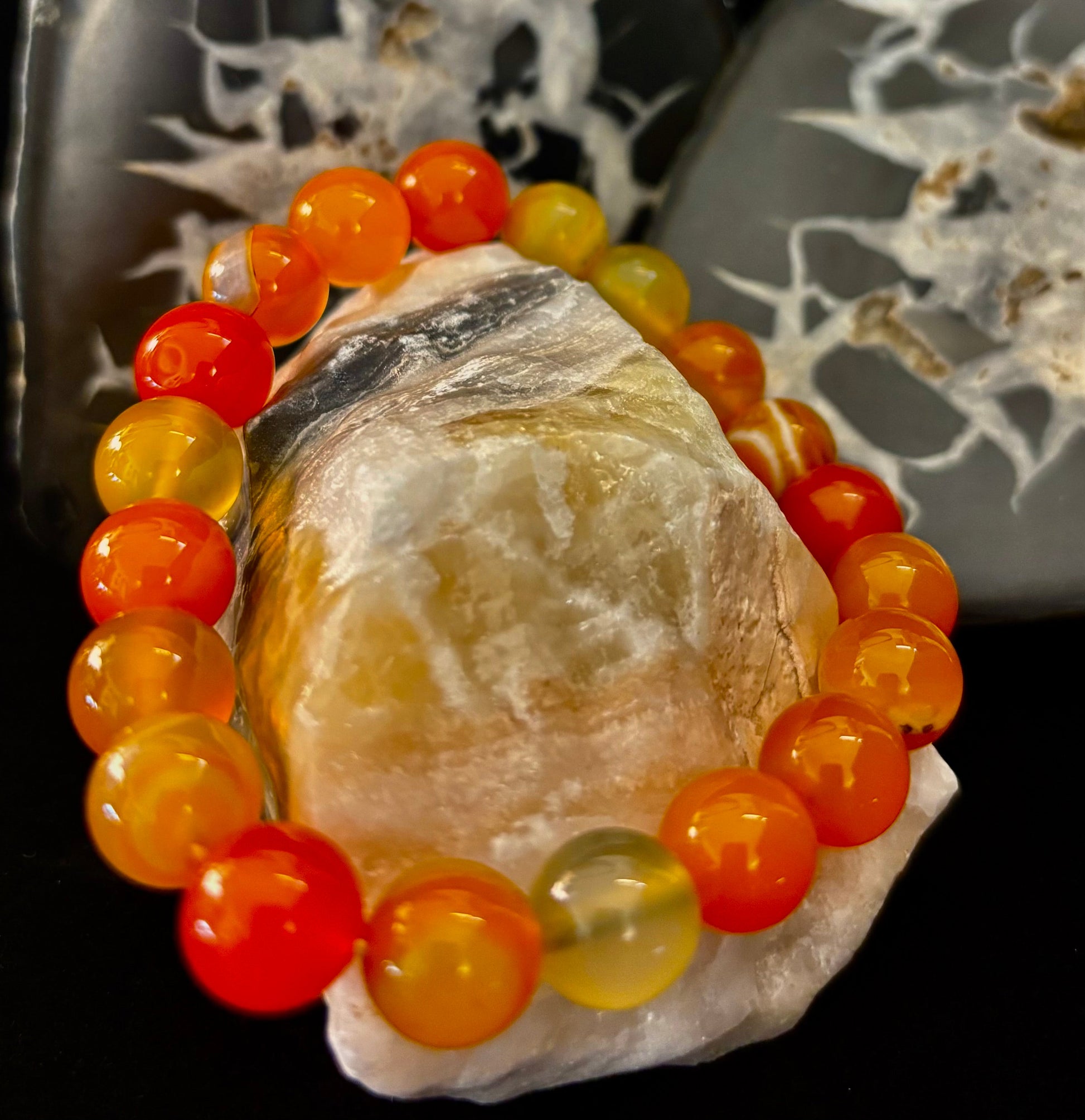 Infuse your day with warmth, balance, and creative energy with our Natural Orange Striped Agate Bracelet. Handcrafted with polished 10mm agate beads, each stone displays unique bands of orange, amber, and cream — a reminder of the beauty found in nature’s harmony.