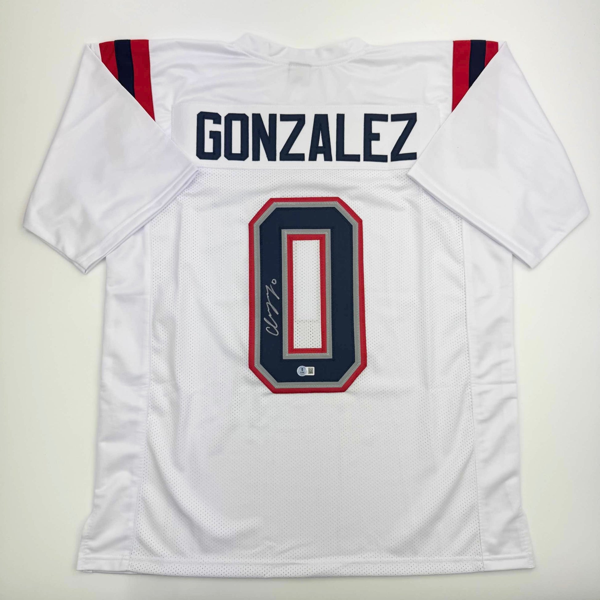 Autographed/Signed Christian Gonzalez New England White Football Jersey Beckett BAS COA