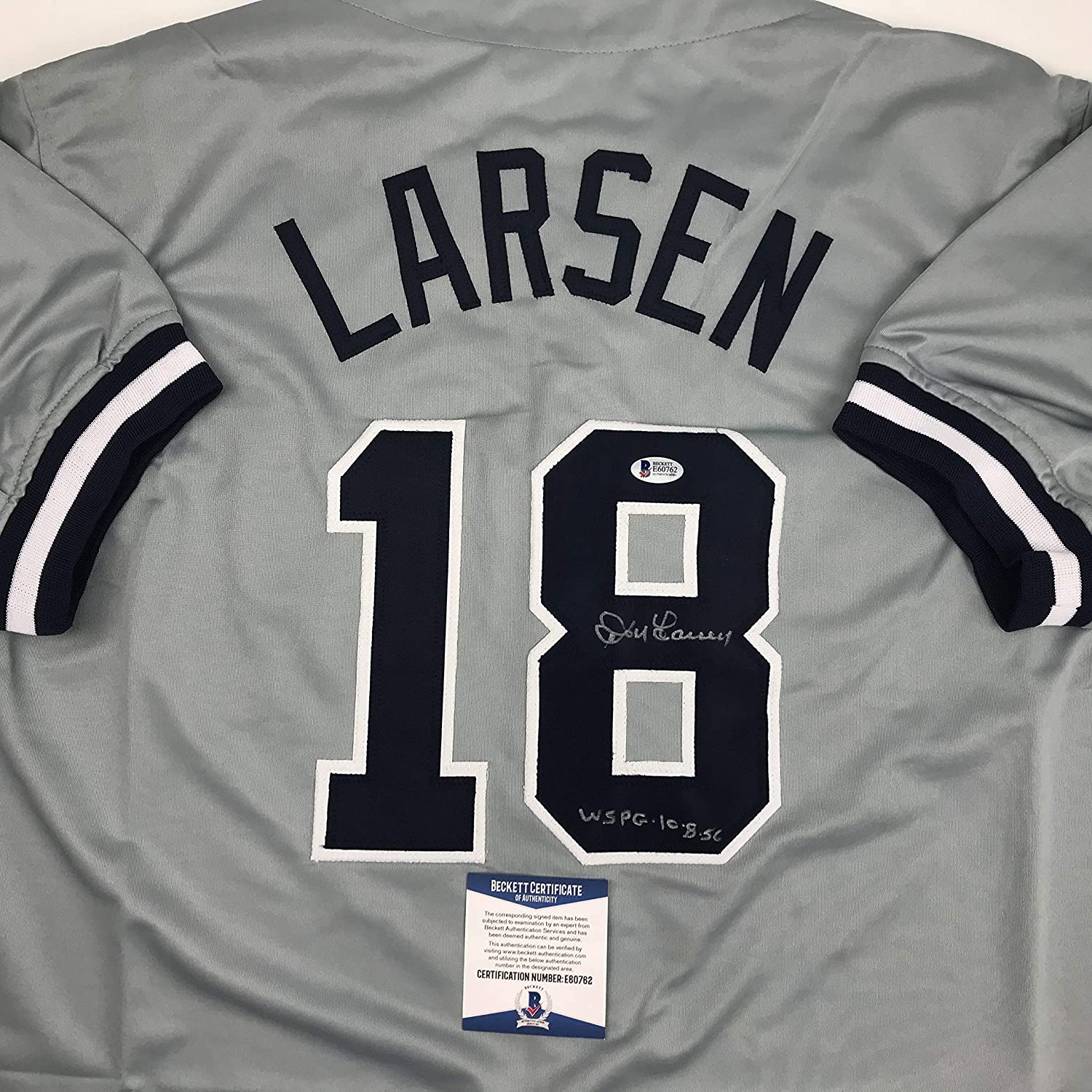 Autographed/Signed Don Larsen WS PG 10-8-56 New York Grey Baseball Jersey Beckett BAS COA