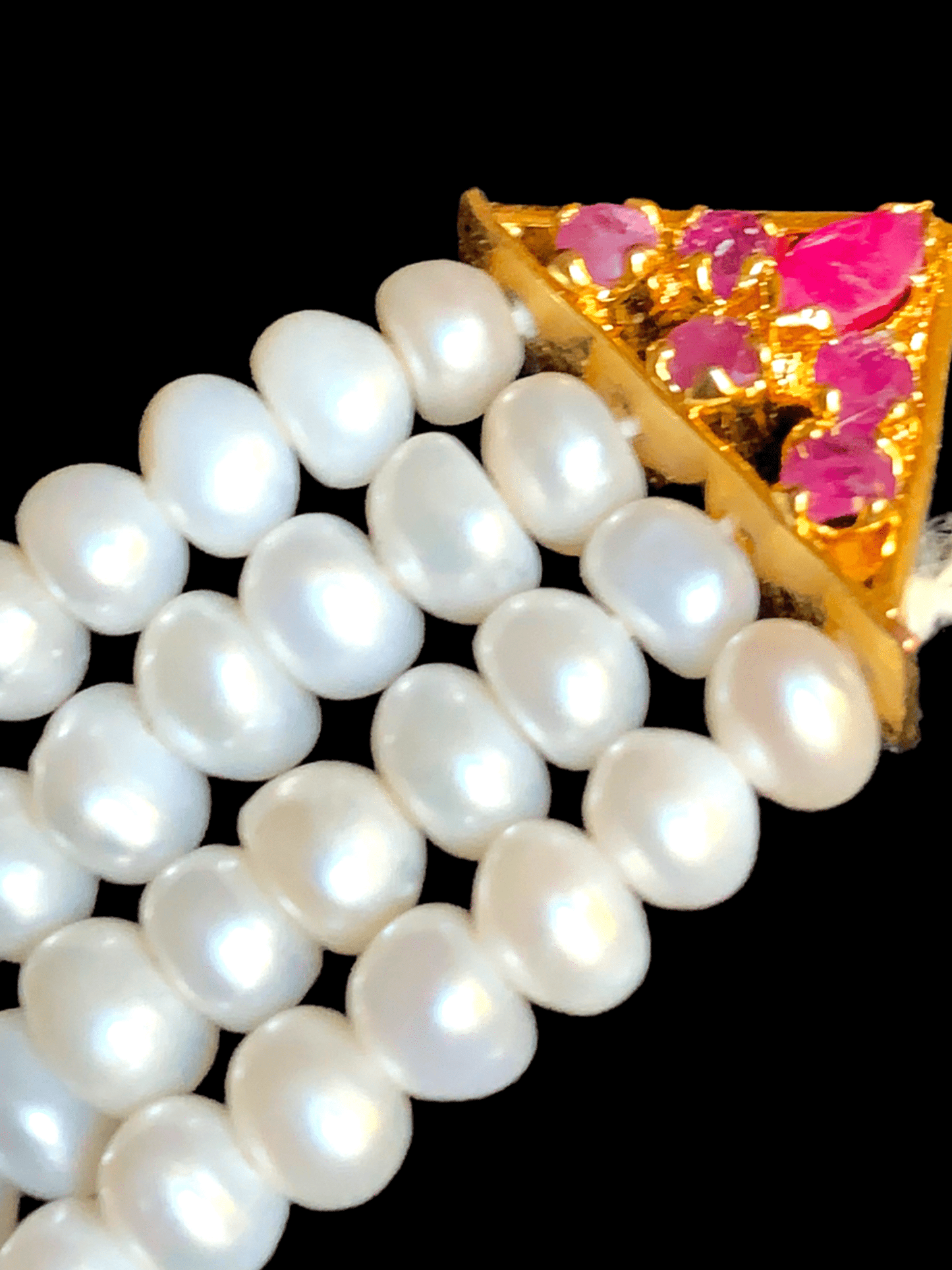 made using fresh water pearls with ruby stones