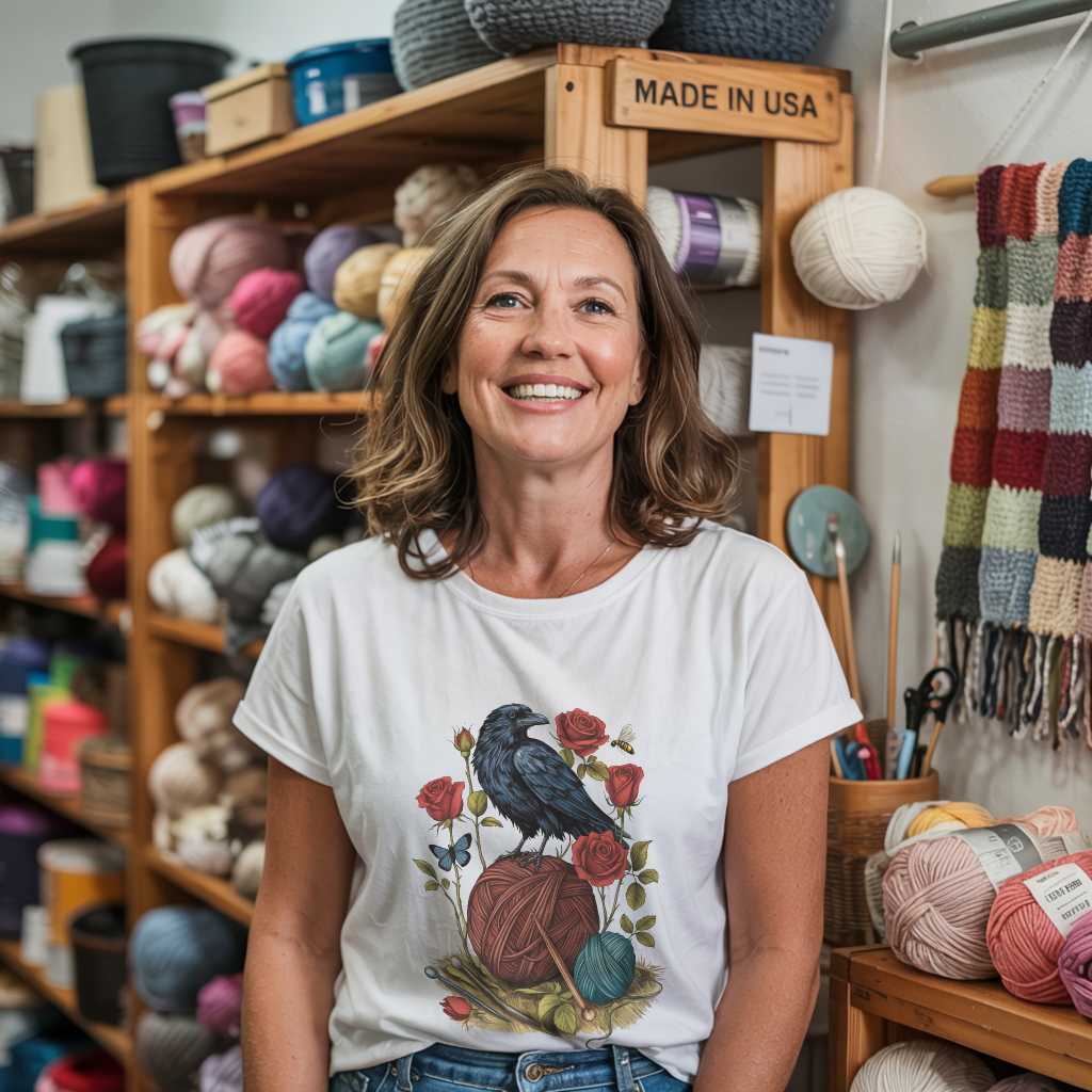 Enter a world where dark elegance and crafty charm intertwine. This striking design showcases a majestic black raven perched upon rich red and teal yarn balls, surrounded by blooming red roses, butterflies, and golden needles—an ode to gothic whimsy and artistic spirit.