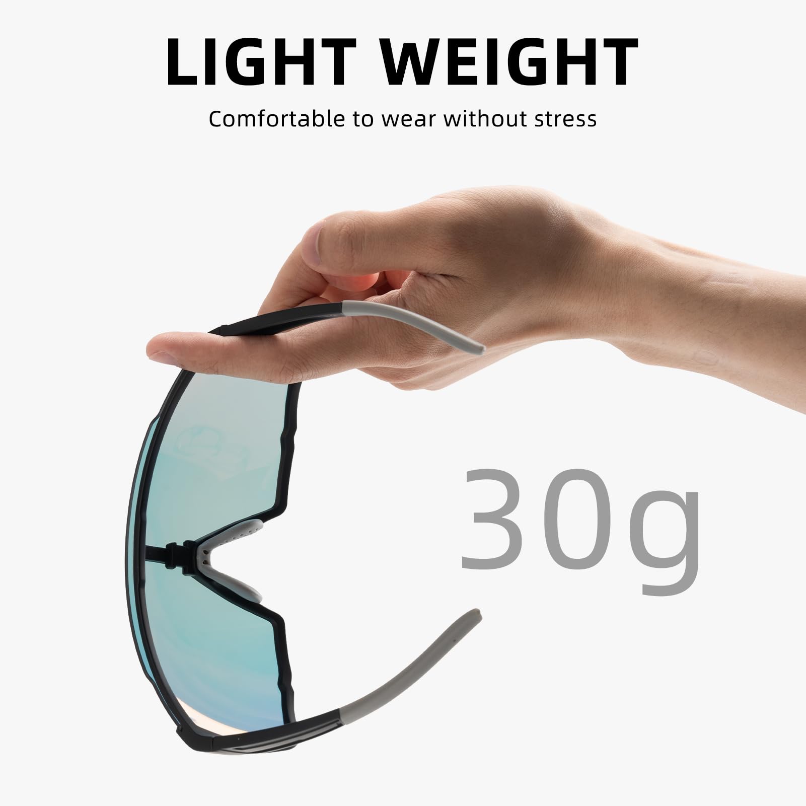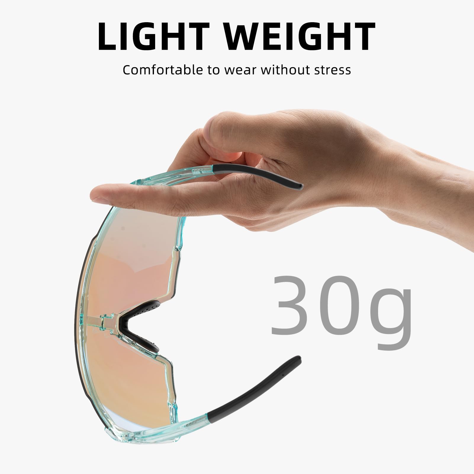 - LIGHTWEIGHT: Weighing in at only 30 grams per pair, these cycling sunglasses are perfect for extended wear. Crafted with TR material and rubber splicing, the temples provide a lightweight yet sturdy feel, reducing pressure on your nose and temples.