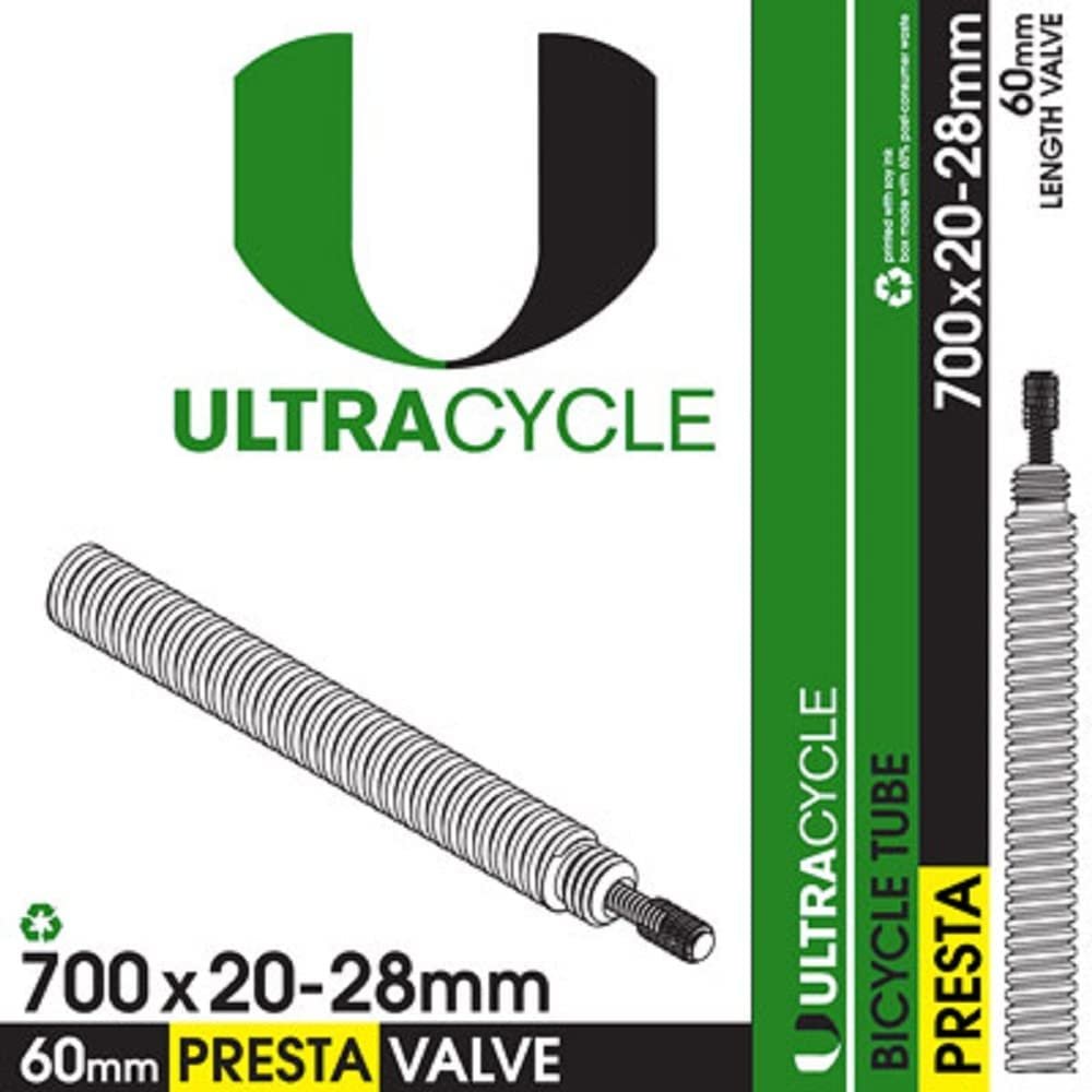 Keep your bike rolling with Ultracycle's bicycle inner tubes. Made from butyl rubber to be practical and reliable. PRESTA VALVE TUBE 700c x 20-28 mm, 60 mm.
