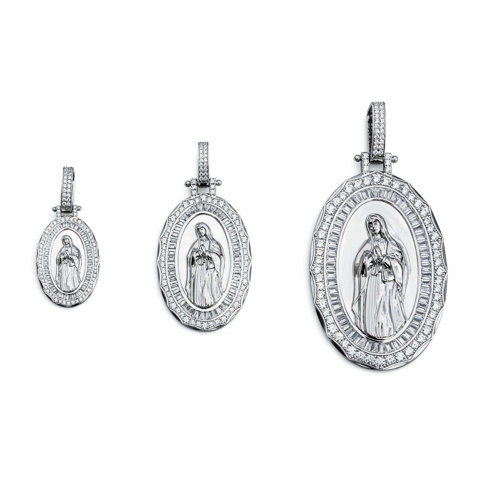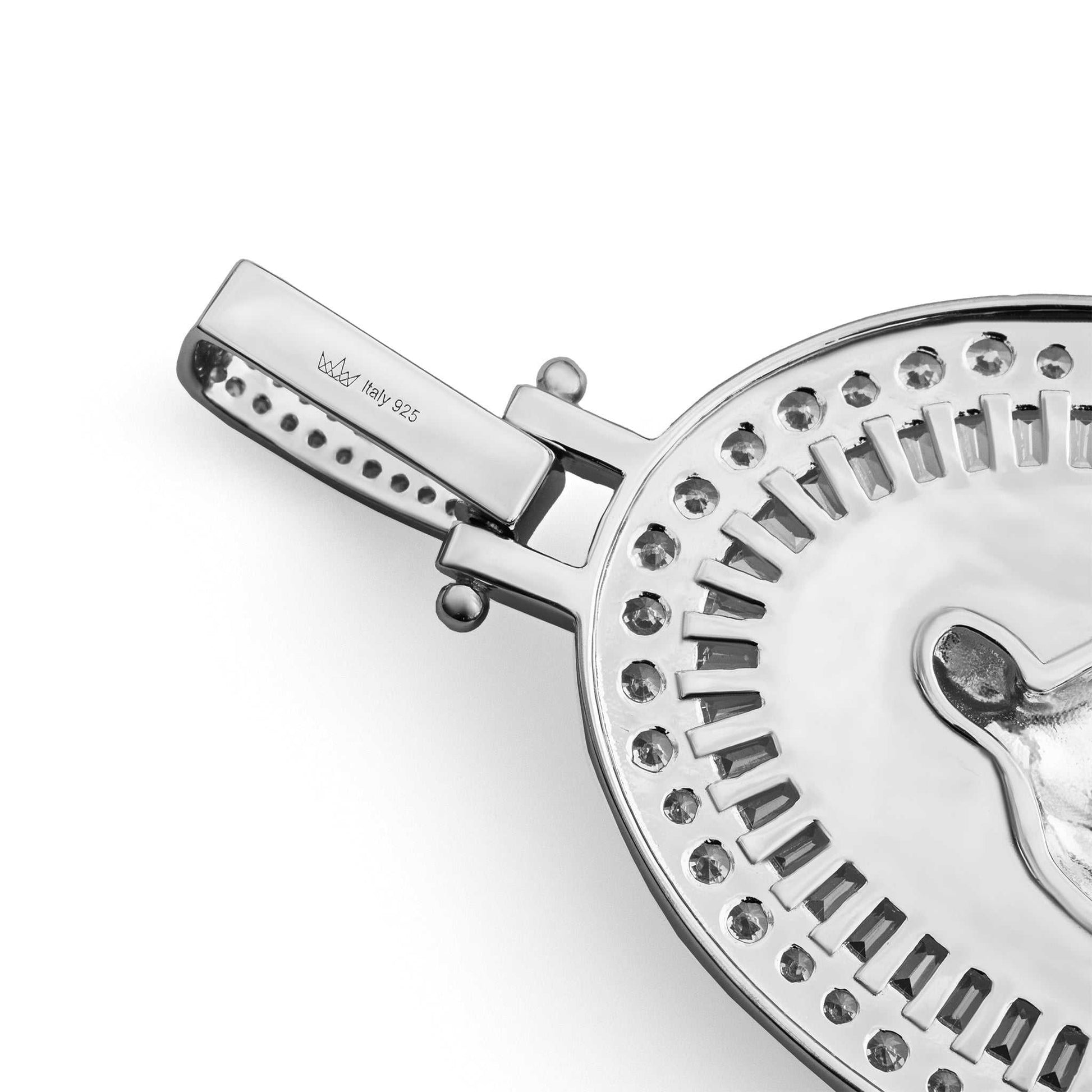 Featuring an intricately detailed image of the Virgin Mary framed in a classic oval shape, this amulet-style piece is fully iced with clear CZ stones and finished in high-polish rhodium for lasting shine.