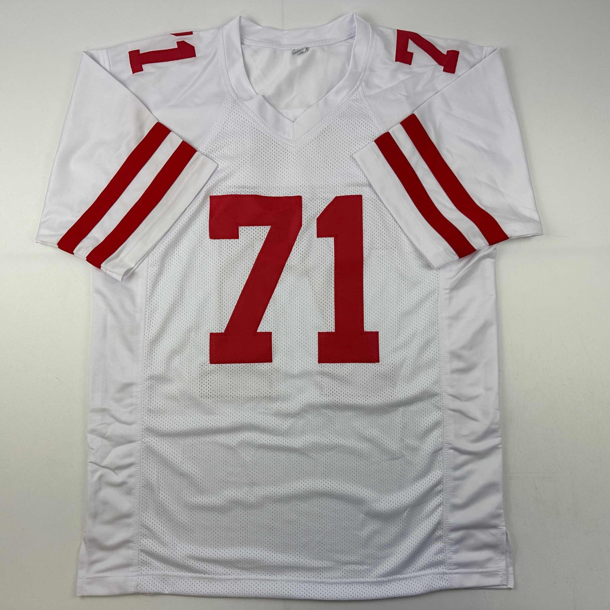 Jersey has no brand names or logos. This is a custom jersey and was not manufactured by or in any manner associated with any professional sports league or manufacturer. This custom jersey carries no professional sports league designation. The item is intended to be an autographed collectible. The custom jersey displays the name and number of the player. This item in no way is affiliated with or connected to any professional sports organization. Size is XL.