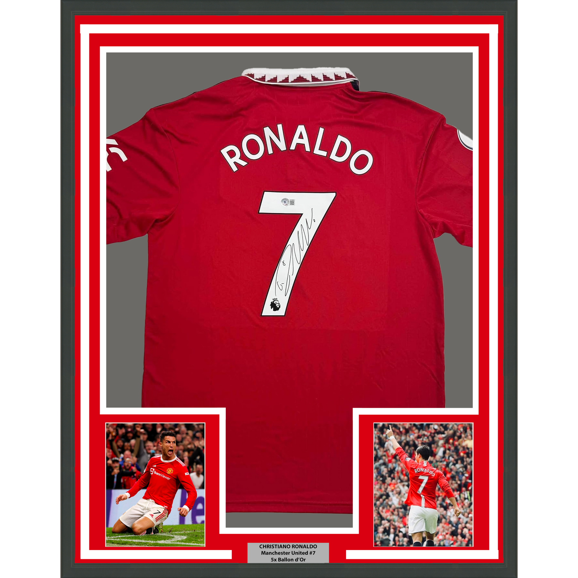 Framed Autographed/Signed Cristiano Ronaldo 35x39 Manchester United Red 2022-23 Soccer Jersey Beckett BAS COA