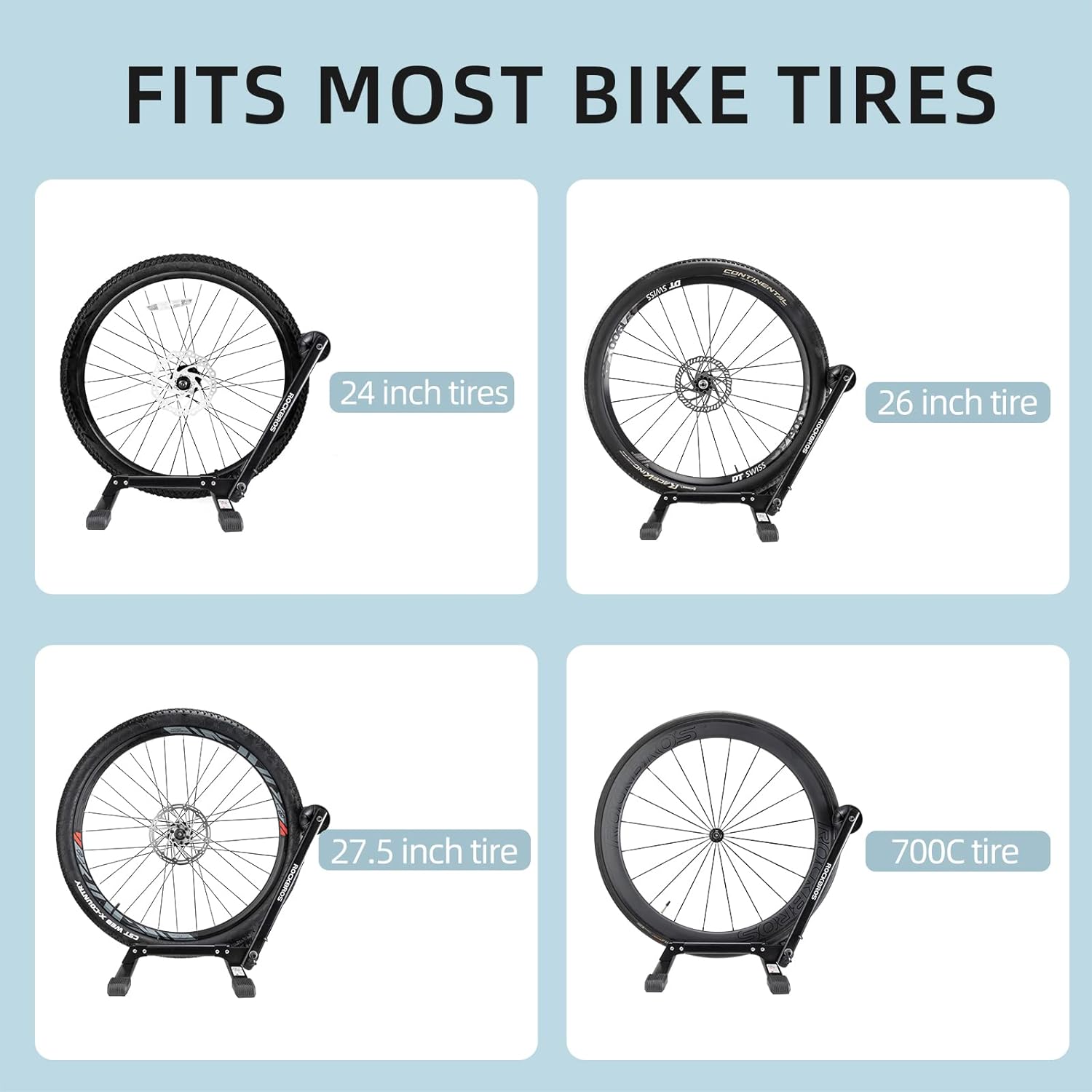 - 【Multiple Purpose】Dual tire chocks, front and rear tire can be parked. Designed for a multi size tires for horizontal bicycle parking, storage or display. Compatible with 650C-700C road and gravel bikes, 26”-29” mountain bikes, and 20”-24” kid’s bikes. Suitable for people who using this bike stand to hold a bicycle that has no kickstand.