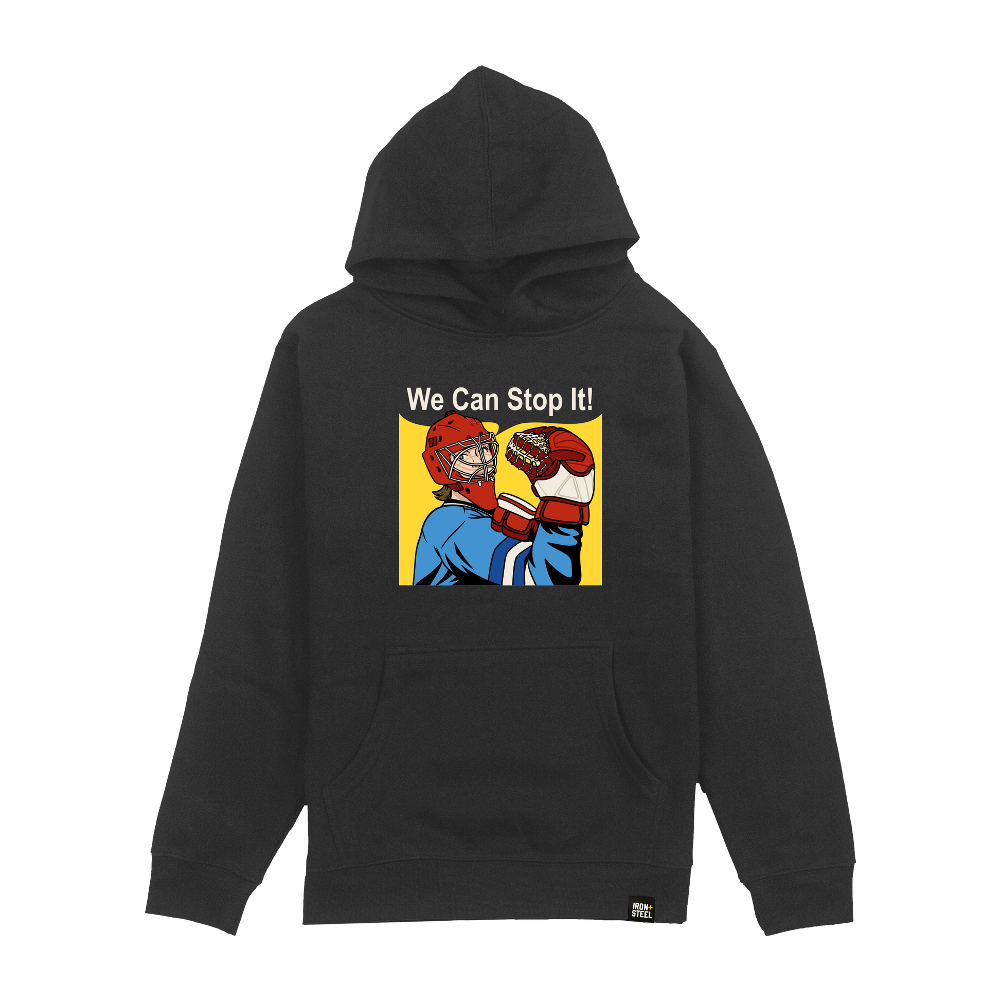 Gear up with confidence in our Youth Hockey Goalie Hoodie, inspired by the iconic Rosie the Riveter and her unstoppable spirit. Featuring the empowering slogan "We Can Stop It," this hoodie is perfect for young goalies ready to take on every puck and show their strength on the ice.