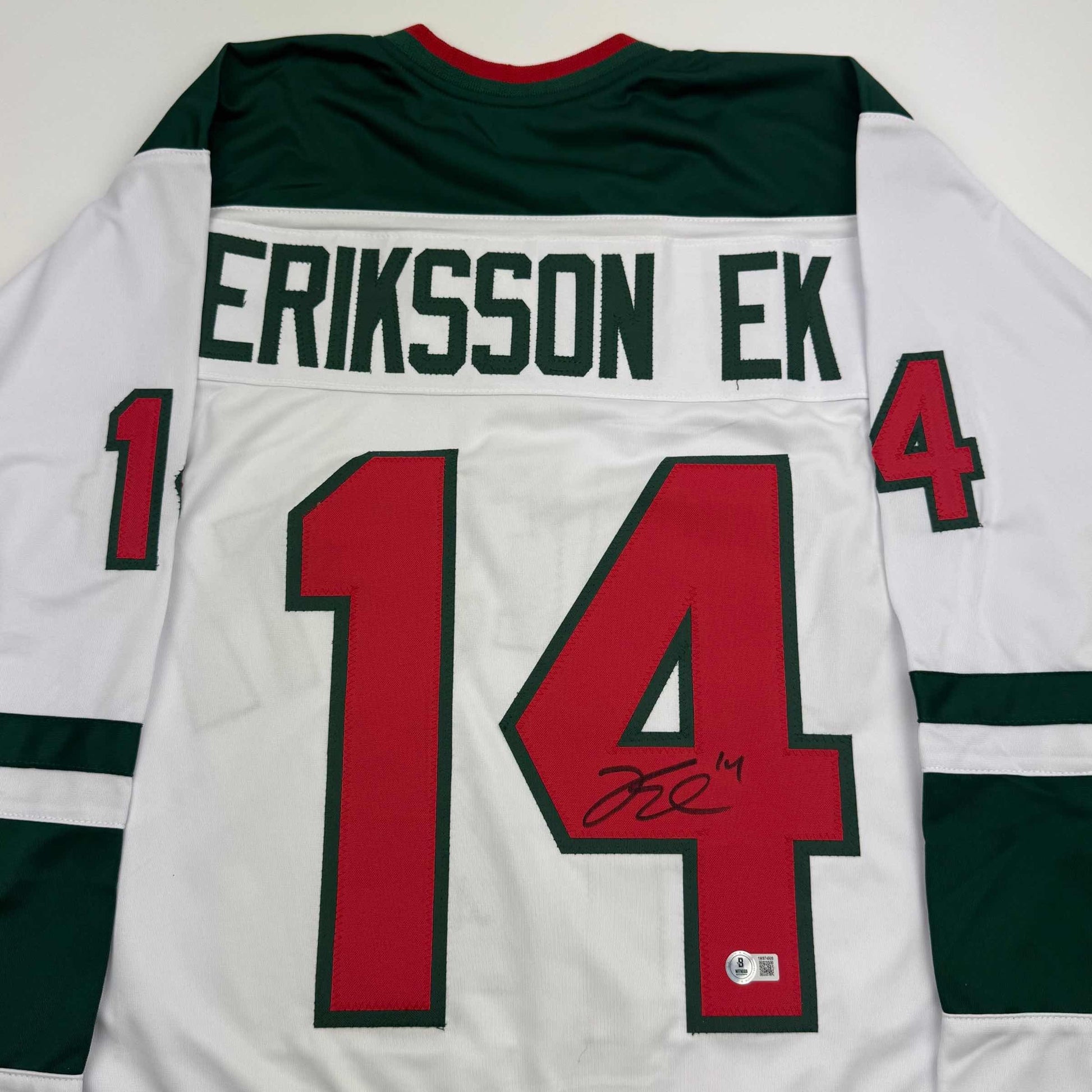 Autographed/Signed Joel Eriksson Ek Minnesota White Hockey Jersey Beckett BAS COA