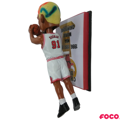 This bobblehead features Dennis Rodman diving for a loose ball. A member of the NBA Hall of Fame Class of 2011, this bobblehead is a must have for any Bulls or Dennis Rodman fan. It is produced exclusively for the National Bobblehead Hall of Fame and Museum and is officially licensed by the Chicago Bulls and the NBA.