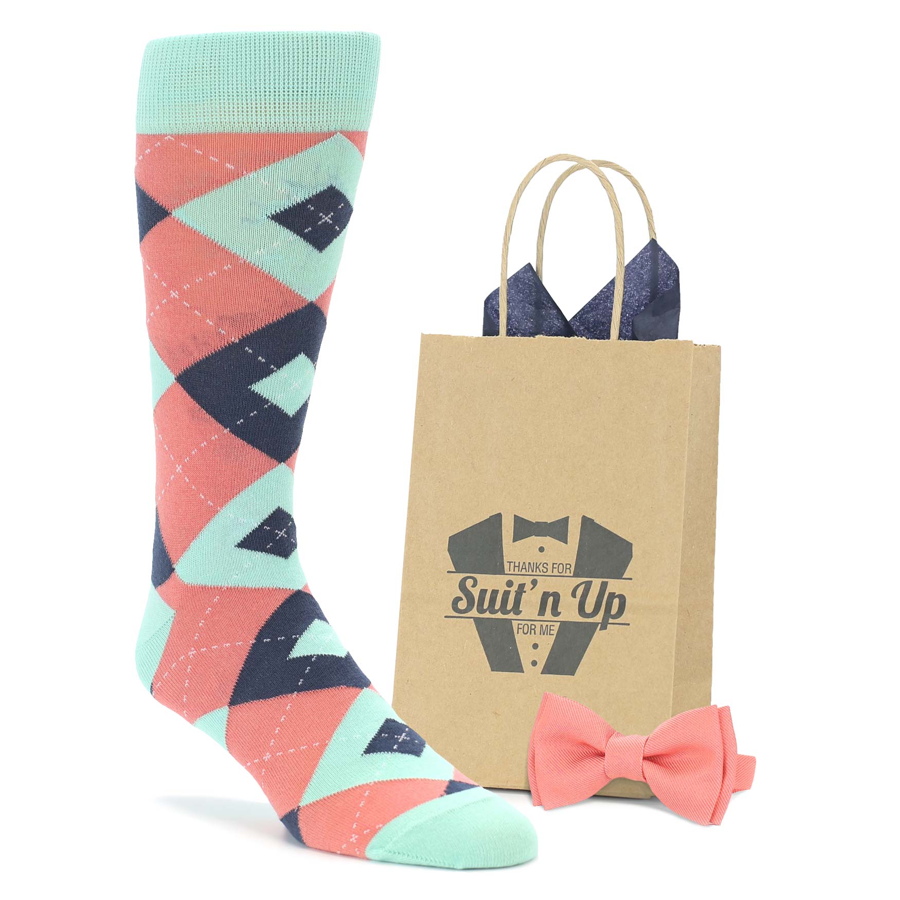 Avoid the guesswork of matching wedding dress socks and ties. Product includes one pair of argyle coral mint groomsmen socks, a matching coral adjustable size bow tie, and a groomsmen party favor gift bag.
