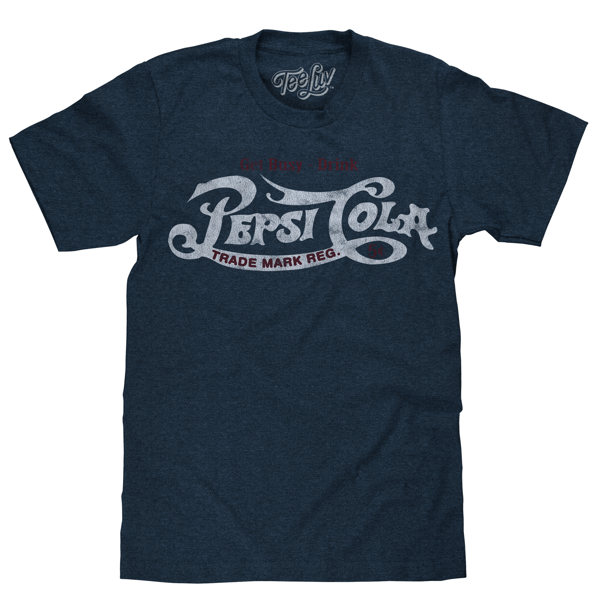 Take a step back in time when this bigger and better cola cost only a nickel! We selected the retro "Pepsi Cola" logo, and the "Get Busy - Drink" text for this tee. To complete the vintage feel on this Pepsi shirt - we've printed it on the highest quality, poly-cotton Navy Heather tee we could find. Perfect for kicking back with an ice cold Pepsi, or just everyday casual wear!