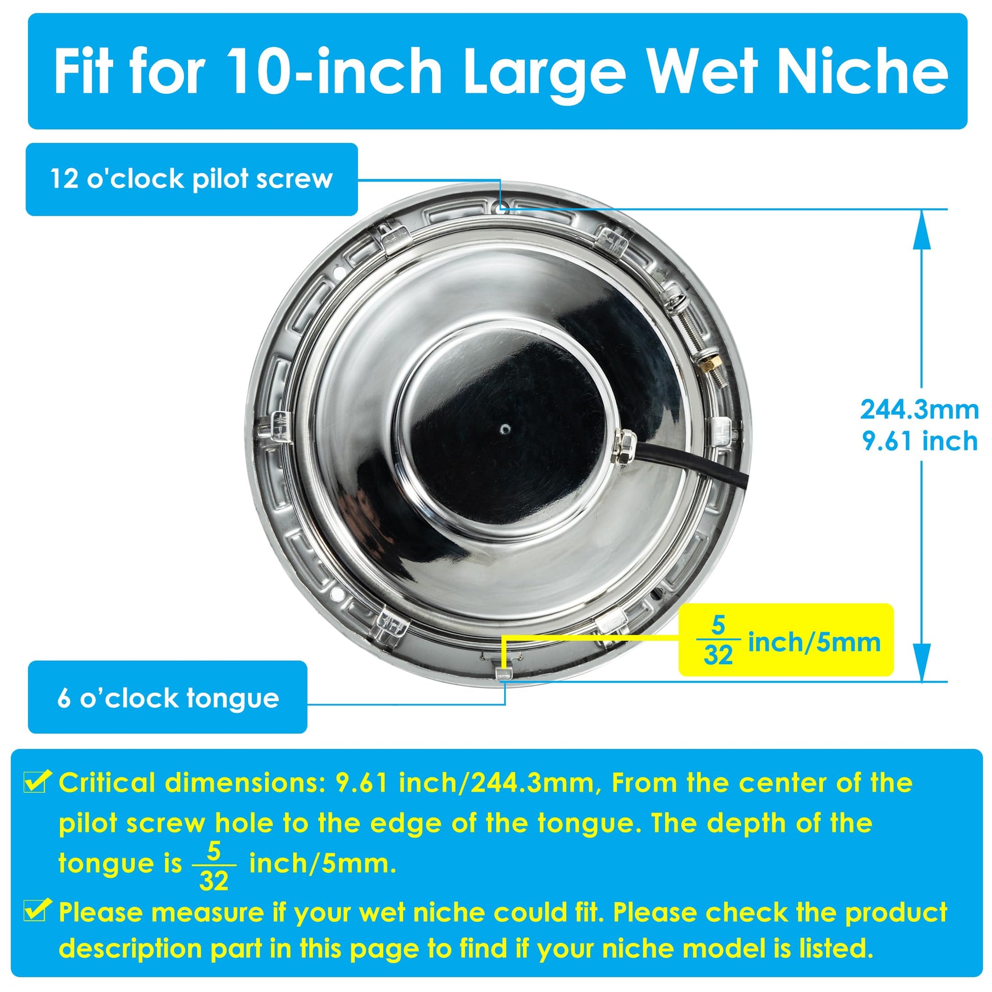 The light requires a wet niche/housing and is designed to fit standard 10-inch wet niches with a 12 o'clock pilot screw and 6 o'clock notch. Light fixture dimensions: 10" diameter face ring, 4" diameter back housing, 3" deep. Please verify compatibility with your pool before purchase.